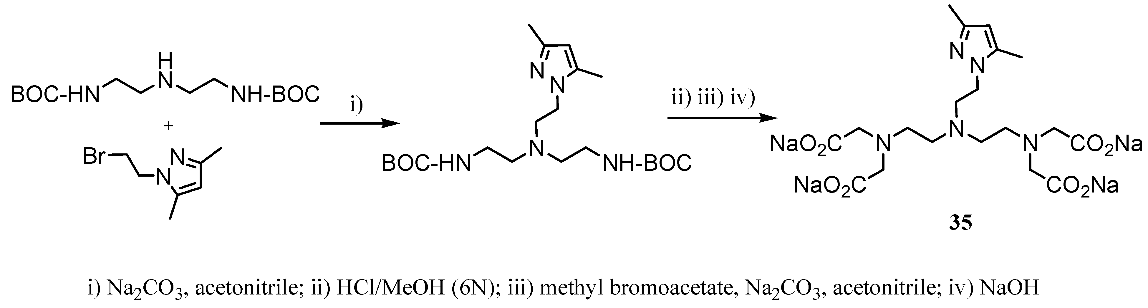 Recently, we reported an experimental and theoretical study of lanthanide complexes of the modified dtpa derivative 35 that includes a 3,5-dimethylpyrazolylethyl arm, corroborating the effective azole coordination with the metal center [26]. This compound was synthesized starting from N,N’-Boc-diethylenetriamine using a similar synthetic approach as for 33, which gave 35 in 83% overall chemical yield (Scheme 9). The corresponding Gd-complex of 35 exhibited an r1 value of 5.1 s-1mM-1 measured at 60 MHz and 310 K.