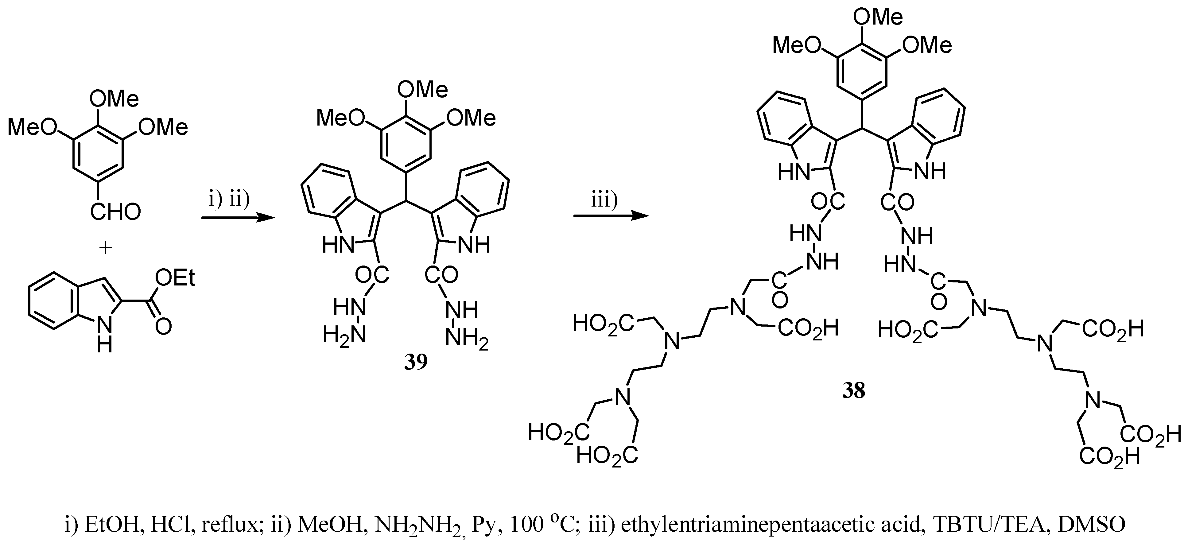 Parac-Vogt et al. [29] reported a stable dinuclear Gd(III)-complex of compound 38 exhibiting a r1 value of 13.6 s-1mM-1 (20 MHz, 25 ºC). Compound 38 was prepared from the bis-indole derivative 39, which was attached to two units of dtpa using TBTU/TEA in DMSO, according to Scheme 11.