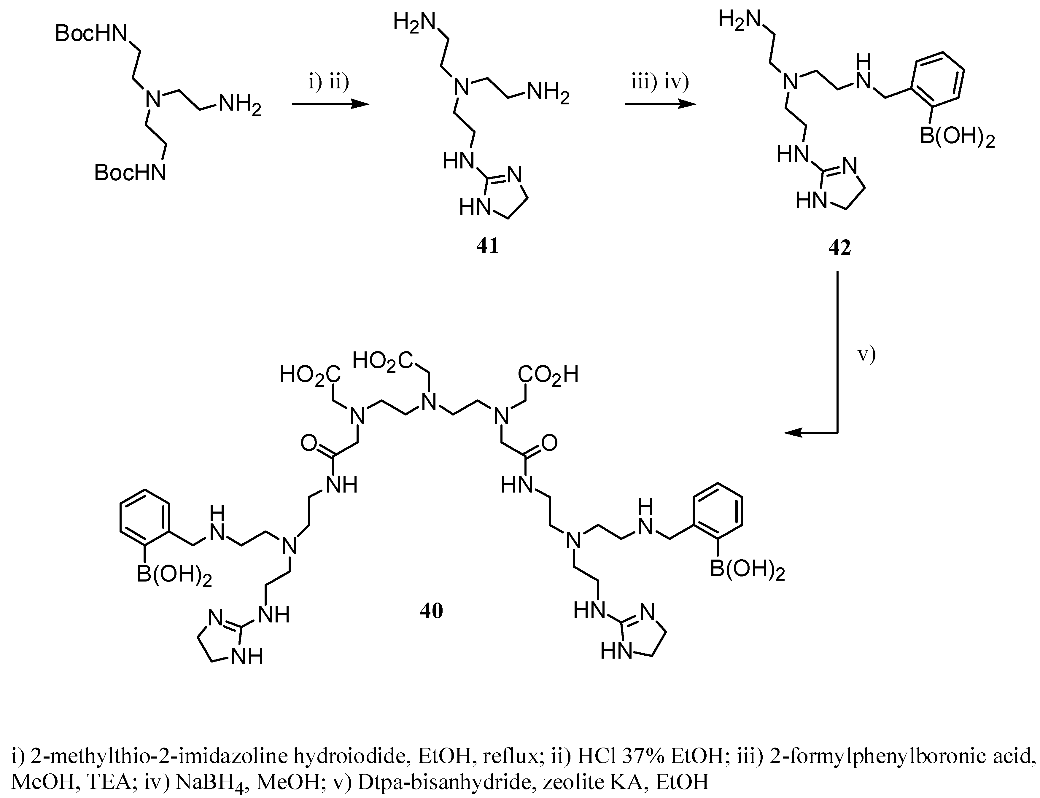 Frullano et al. [30] synthesized a Gd-complex of 40 able to recognize and reversibly bind to sialic acid residues (Scheme 12), often proposed as diagnostic indicators in several diseases. Ligand 40 was synthesized from tri(ethylamine)amine (TREN) with two amine groups protected as tert-butoxy-carbonyl (Boc) moieties and subsequent treatment with 2-methyl-2-thioimidazoline hydroiodide in refluxing ethanol. Removal of the Boc protecting groups in acidic medium afforded compound 41, which reacted with 2-formylphenylboronic acid giving the corresponding imine. Reduction of the latter and subsequent separation leaded to the monoamine 42. Finally, 40 was prepared by condensation between compound 42 and the dtpa-bis-anhydride (Scheme 12).