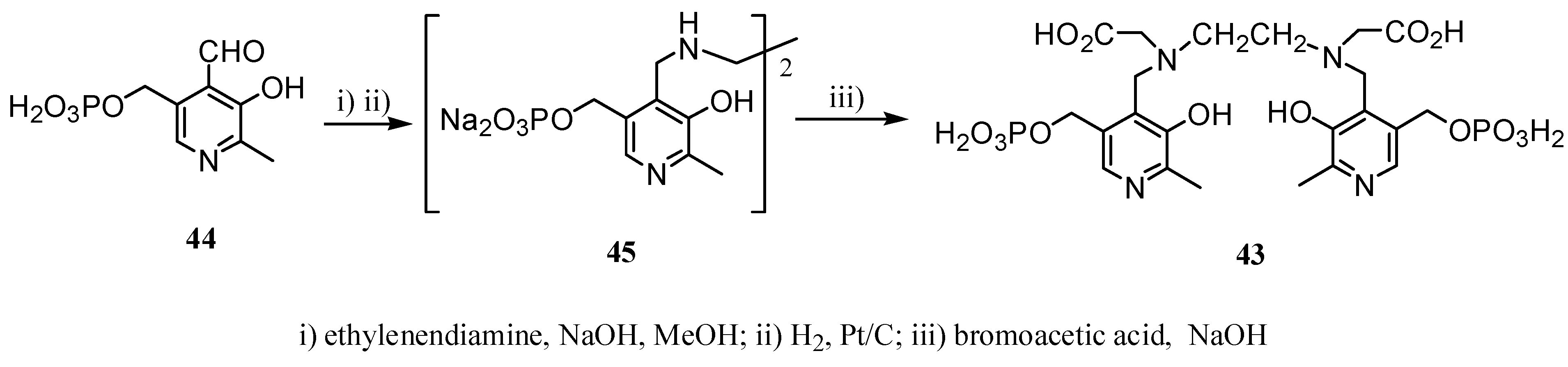 One of the first CAs that included pyrimidine rings in its structure was the Mn(II) complex of N,N´-dipyridoxylethylenediamine-N,N´-diacetate 5,5´-bis(phosphonate) (DPDP, 43), considered the active component of Teslascan®, a contrast medium for hepatic MRI [31]. This complex was synthesized in 1989 from pyridine 44 by condensation with ethylenediamine and subsequent reduction of the corresponding imine affording compound 45. Alkylation of amine groups in 45 with bromoacetic acid in basic medium gave 43 (Scheme 13) [32].