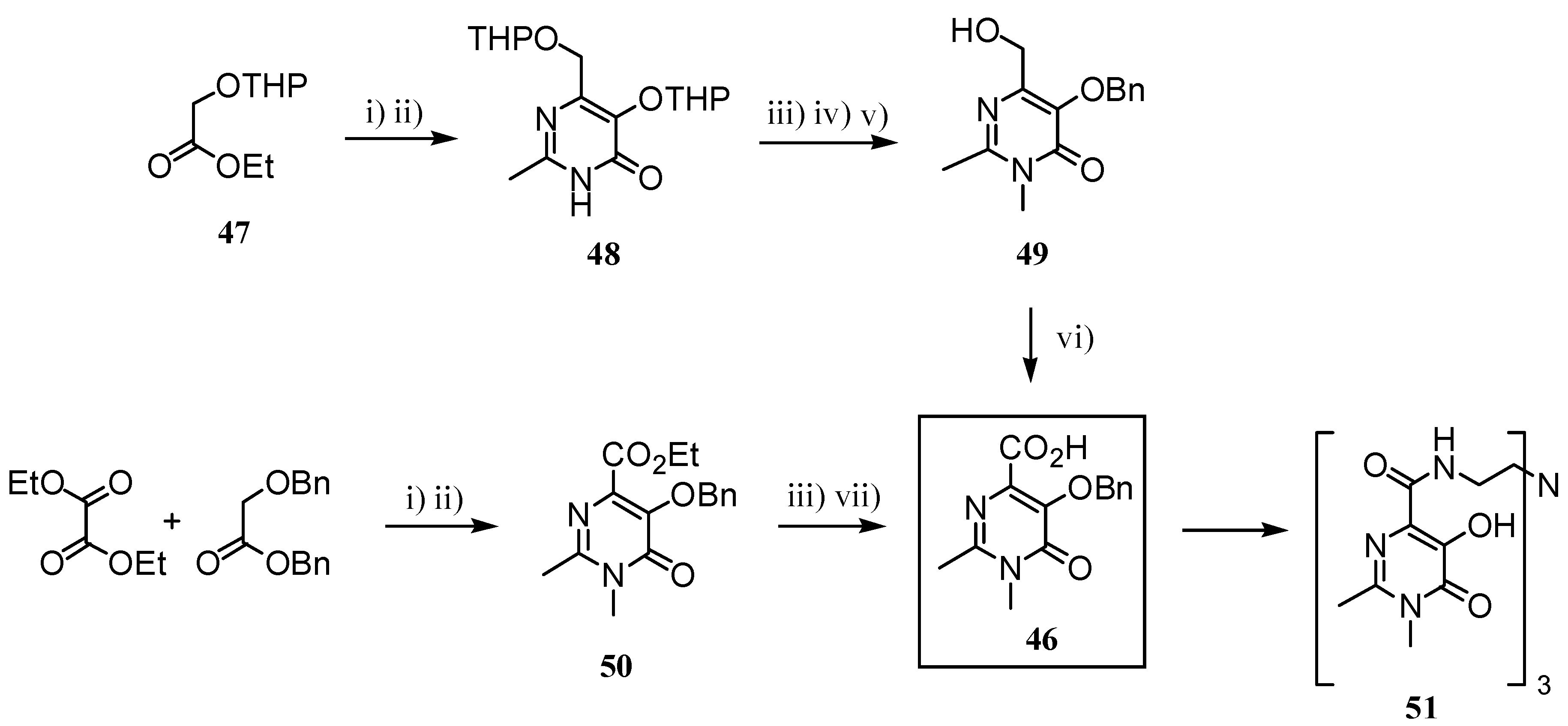 Recently, 4-benzyloxy-5-pyrimidinone carboxylic acid 46 was reported as a building block to prepare several ligands through coupling with the corresponding amine. Two synthetic routes leading to 46 were reported (Scheme 14) [33]. One of them starts with self-condensation of 47 and subsequent in situ reaction with acetamidine, giving compound 48. Nitrogen methylation followed by hydroxyl group deprotection in an acidic medium and benzylation of the freed hydroxyl moiety at the 5-position yielded compound 49. Finally, oxidation of 49, using phase transfer conditions, afforded the acid 46. The second approach was a shorter one starting from diethyl oxalate and benzyl benzyloxyacetate. Condensation of both, in the same conditions mentioned above, leaded to ester 50, which by nitrogen methylation and basic hydrolysis of the ester group yielded the desired acid 46. Coupling of 46 with amines may produce a large series of hydroxypyrimidinones. Particularly, the Gd-complex of 51 exhibited a relaxivity value of 9.0 s-1mM-1 measured at 20 MHz and 25 ºC.