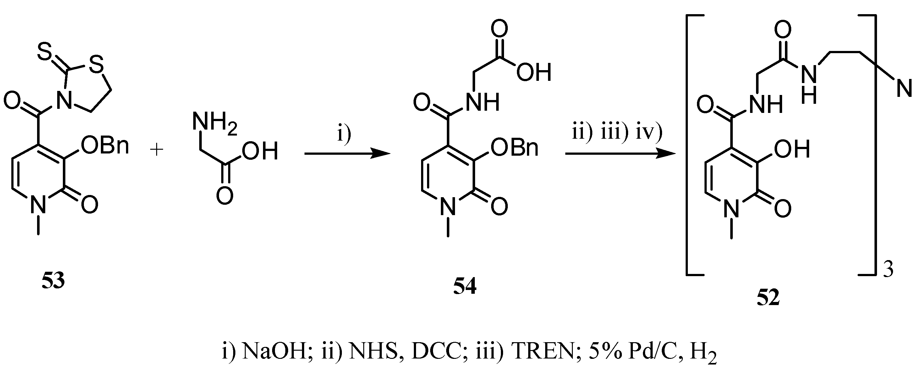 Activation of 54 using N-hydroxy-succinimide (NHS), followed by amidation with TREN and subsequent benzyloxy group deprotection afforded compound 52. The corresponding Gd(III)-complex showed improved relaxivity (6.6 s-1 mM-1 at 20 MHz and 298 K), compared to the CAs normally used in clinical diagnosis. However, its stability constant decreased slightly with respect to the analogous 51 without the glycine unit. Bis-hydroxypyridonate chelates were investigated, the MR imaging investigations and biodistribution being reported [35].