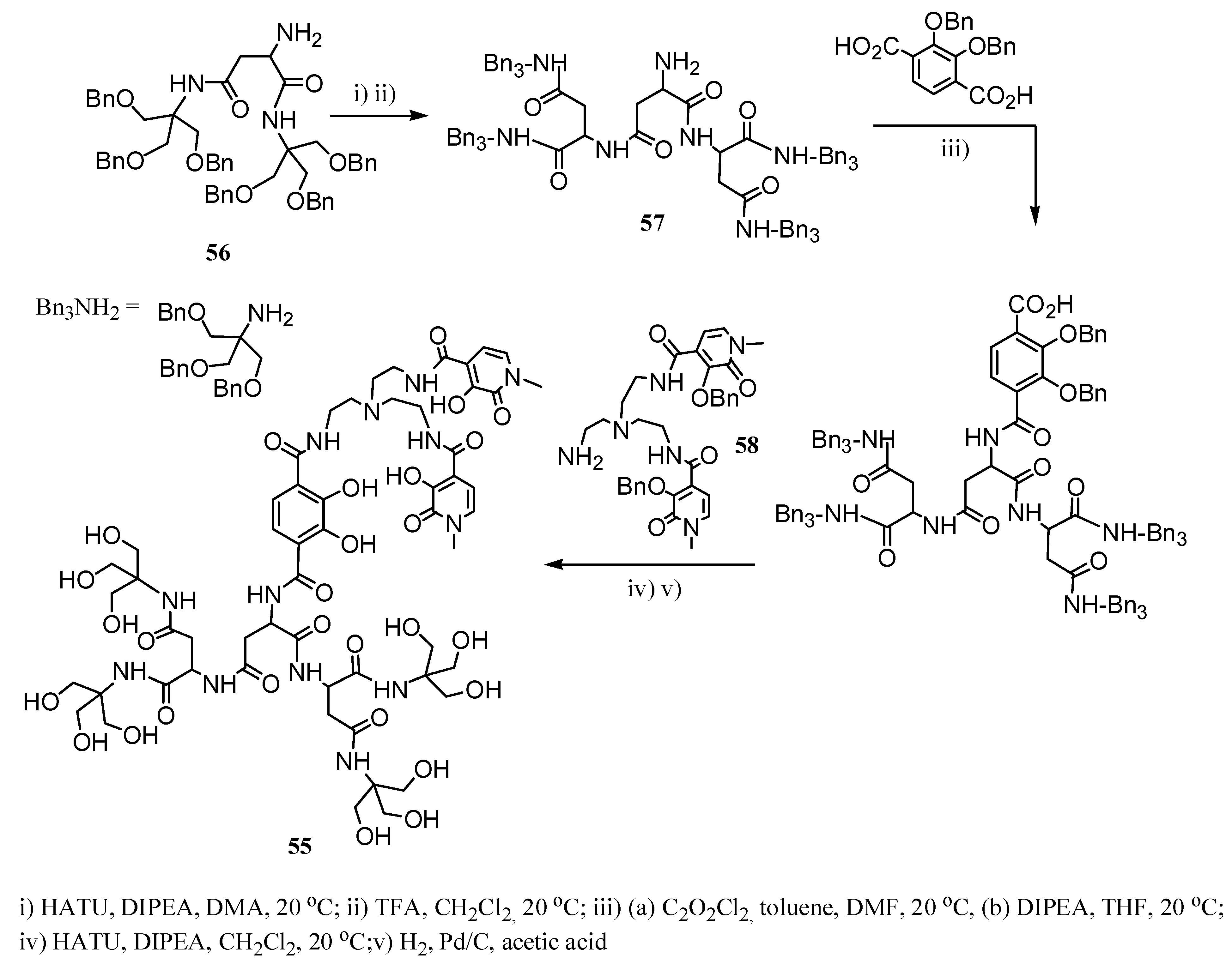 Reaction of tris-benzyloxyethanolamine and N-tert-butoxycarbonylaminoaspartic acid in the presence of the coupling reagent, HATU (N-[(dimethylamino)-1H-1,2,3-triazolo-[4,5-b]pyridin-1-ylmethylene]-N-methylmethanaminium hexafluorophosphate N-oxide), and subsequent deprotection of the amino group in an acidic medium led to compound 56. Coupling of 56 with an additional aspartic acid unit and subsequent deprotection of the amino group afforded 57. Amidation reaction between 2,3-benzyloxyterephtalic chloride and 57, followed by coupling with compound 58, and hydrogenolysis of benzyl moieties yielded ligand 55. This chelating ligand coordinated one Gd(III) ion showing two water molecules in the inner-sphere.