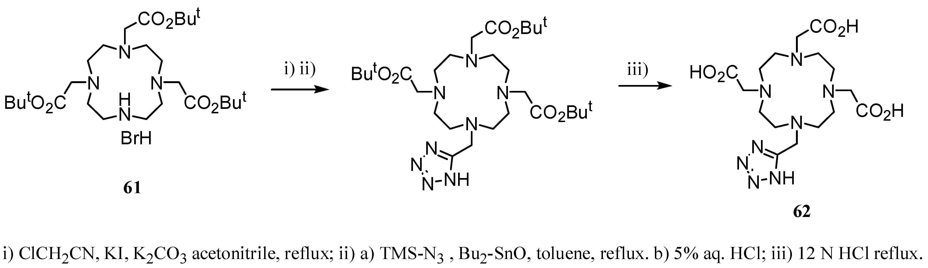Ligand 62 containing a tetrazolylmethyl arm was prepared from compound 61 according to Scheme 17 [41]. Compound 61 was alkylated with freshly distilled chloroethylnitrile under heterogeneous conditions followed by treatment with TMS-N3, in the presence of Bu2-SnO, yielding the corresponding tetrazole derivative, which by acid hydrolysis afforded 62 (r1 of Gd-62 was 4.8 s-1 mM-1 measured at 60 MHz and 37 ºC).