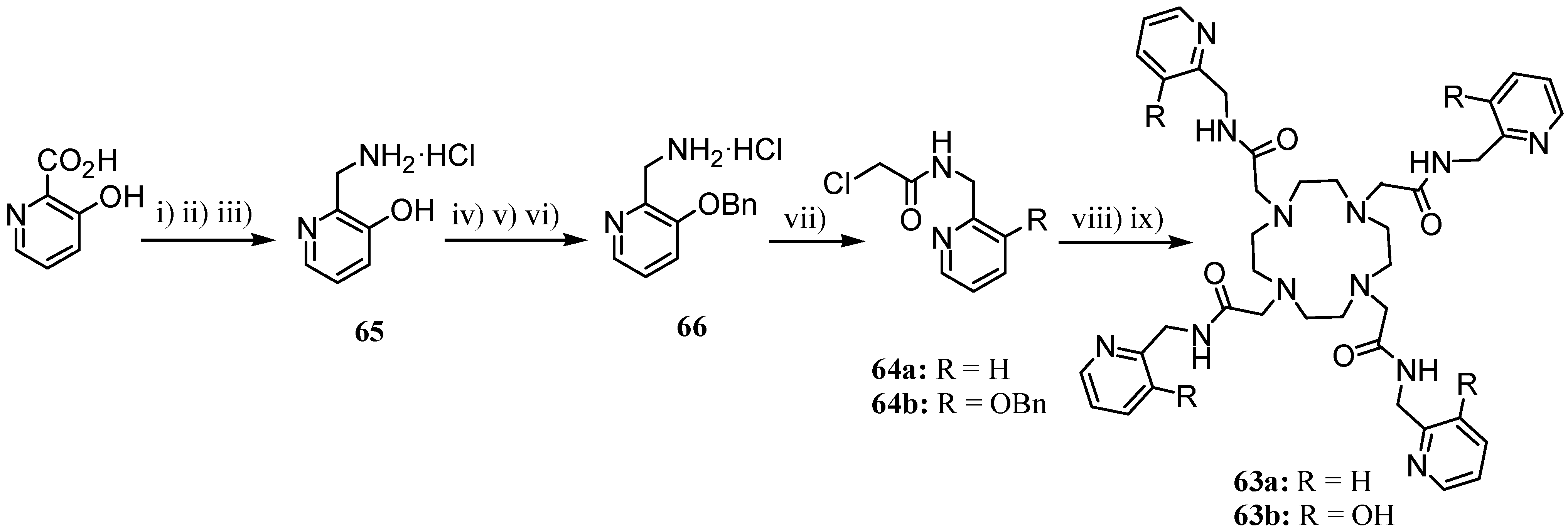 The pH environment of a complex can modify some of the determinant factors that contribute to the relaxivity of CAs, such as the number of water molecules (q) in the inner-sphere of the complex, or even the second coordinating sphere. Pyridylmethyltetraamides 63 derived from Dota were studied as pH dependent CAs [42]. Gd-63b showed a r1 values of 5.6 and 4.1 s-1 mM-1 at pH of 8.5 and 3.3, respectively (20 MHz). Compounds 63 were prepared by alkylation of cyclen with the corresponding chloroacetamide 64 (Scheme 18). Ligands 64a-b were obtained by reaction of chloroacetyl chloride and the corresponding amine. Compound 64b was synthesized from 2-hydroxypicolinic acid by esterification with methanol, transformation of the ester in its amide by reaction with ammonia and subsequent reduction with borane giving amine 65. The protection of the hydroxy group as benzyloxy moiety in 65 was carried out in three steps: i) protection of the amine as tert-butylcarbamate, ii) benzoylation of hydroxyl group and, iii) deprotection of amine group in acidic medium affording compound 66.
