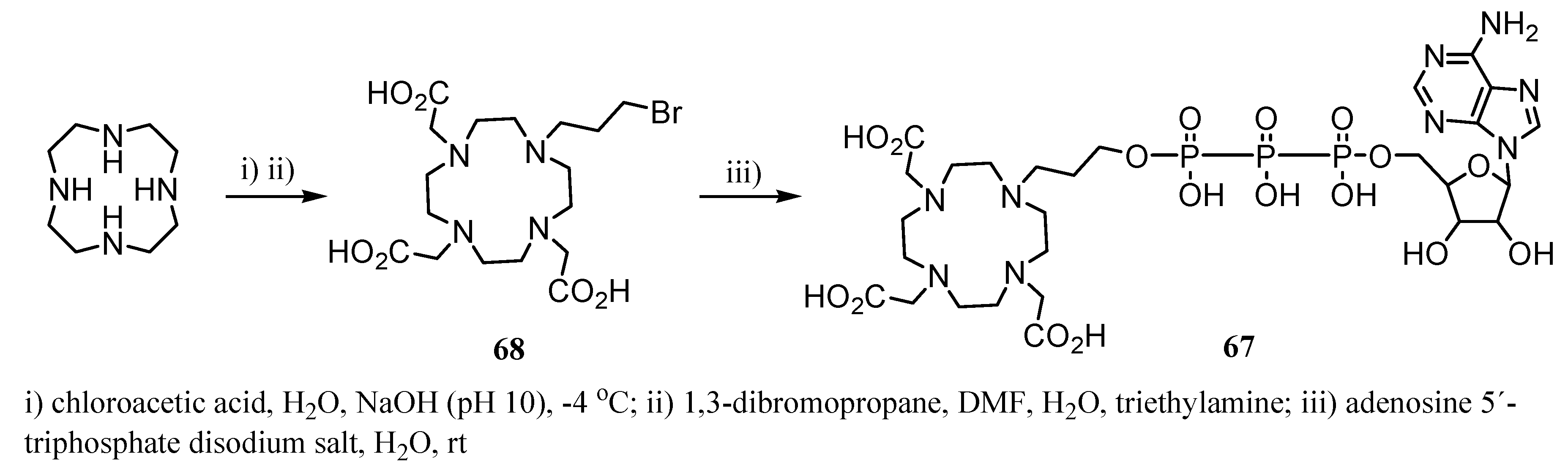 Another example of a CA displaying pH dependent relaxivity is the Gd(III)-complex of ATP-conjugated DO3A 67, reported by Ratnakar and Alexander (6.5 s-1 mM-1 measured at 24 MHz, 308 K and pH of 8.5) [43]. Compound 67 was prepared from cyclen by trialkylation using bromoacetic acid and subsequent reaction with 1,3-bromopropane in basic medium leading to compound 68. Treatment of 68 with ATP disodium salt in water afforded 67 (Scheme 19).