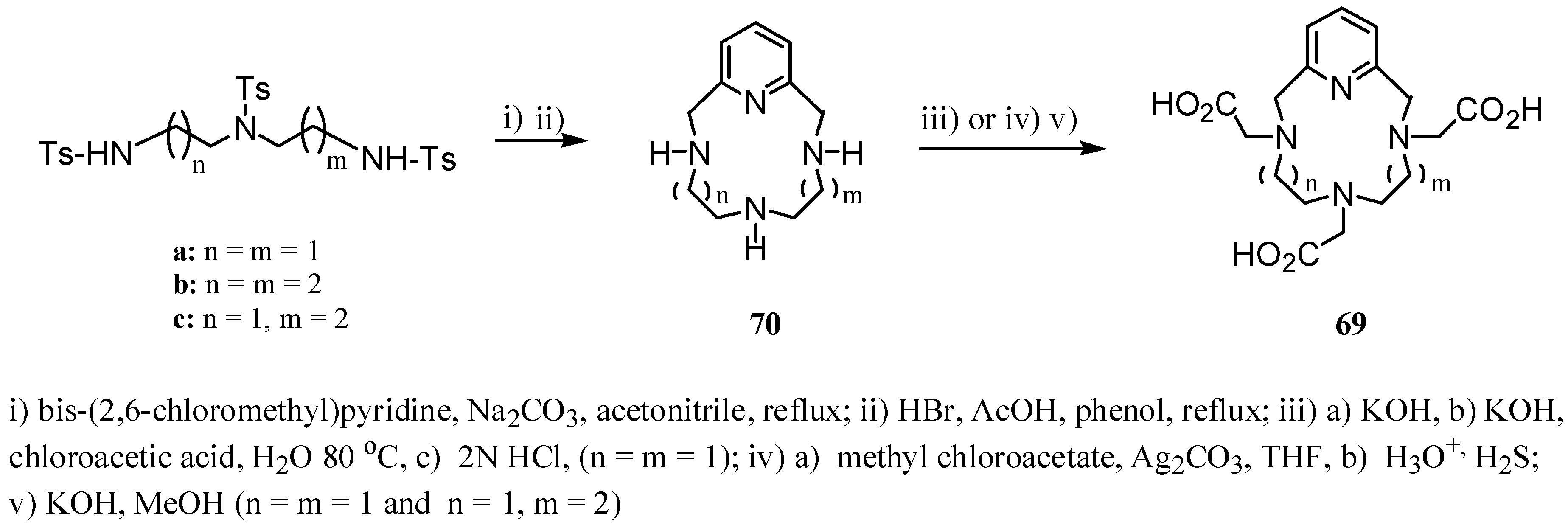 Several contributions have reported novel series of tetraazamacrocycles containing one pyridine ring as part of the macrocycle. Their lanthanide complexes generally showed high stability and improved relaxivity. These heptadentate ligands form stable complexes with lanthanide ions, allowing the coordination of two water molecules in the inner-sphere and consequently providing higher relaxivity than Dota chelates. In general these complexes are characterized by a relatively fast water exchange rate as compared to the octacoordinated ligands. Scheme 20 shows the synthetic approach to prepare 69 [44]. Ligand 69a was synthesized by reaction of 1,4,7-tritosyl-1,4,7-triazaheptane with bis(2,6-chloromethyl)pyridine, followed by deprotection of the amine groups in an acidic medium yielding compound 70a. Alkylation of 70a with chloroacetic acid in the presence of sodium carbonate, and subsequent treatment in acidic medium yielded 69a (Gd-69 showed a r1 of 6.9 s-1 mM-1 at 20 MHz and 25 ºC). Compounds 69b-c were synthesized from the corresponding triprotected amine via the macrocycles 70b-c. The latter reacted with methyl chloroacetate as alkylating agent yielding the corresponding esters, which were hydrolyzed using KOH in methanol. Complexes Gd-69b and Gd-69c exhibited a r1 values of 5.9 and 6.3 s-1 mM-1, respectively (20 MHz and 25 ºC).