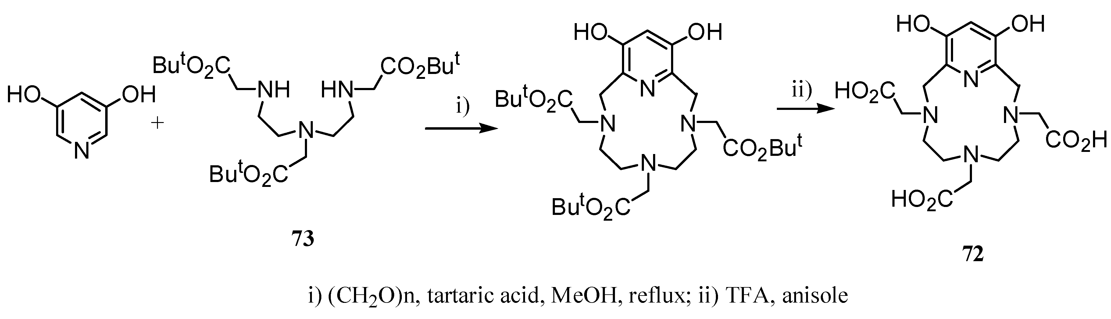 The relaxivity of pyridine-based complexes can be improved through the introduction of polar moieties supported over the heterocyclic ring, a circumstance probably improving the effects of the second coordination sphere. An example of that is the Gd(III)-complex of macrocycle 72, containing two free hydroxyl groups, with r1 of 8.5 s-1 mM-1 at 20 MHz and 25 ºC [23]. Ligand 72 was prepared by double Mannich reaction between 3,5-dihydroxypyridine, paraformaldehyde and amine 73 followed by treatment with neat TFA-anisole (Scheme 21).