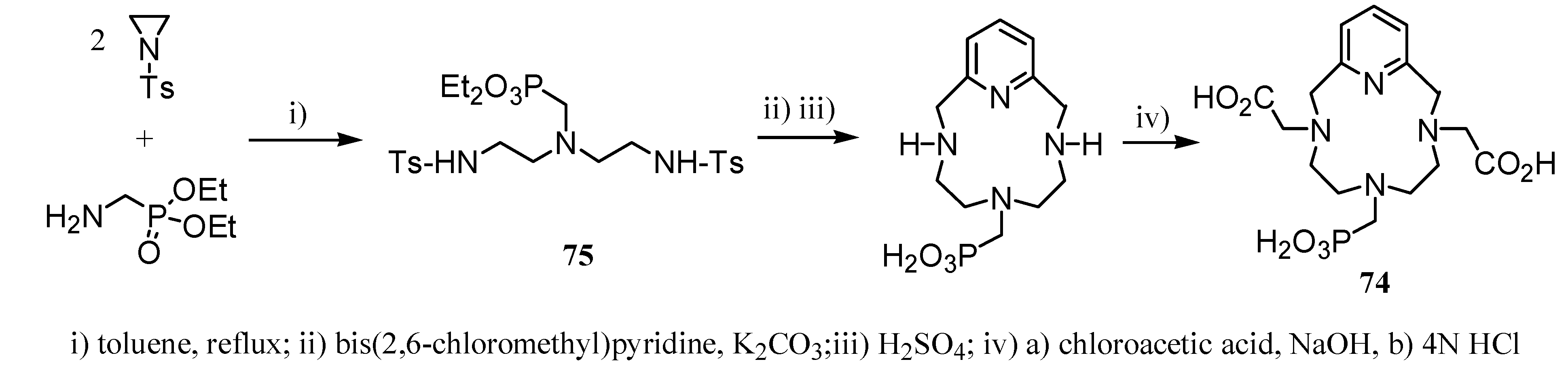 On the other hand, inclusion of the methylenephosphonic arm on triamine backbone of these macrocycles induced higher relaxivity of the corresponding Gd(III)-complexes. Thus, the complex of 74 showed two water molecules in its inner-sphere and another water molecule bound to the phosphate group providing an important contribution to the higher relaxivity (r1 = 8.3 s-1 mM-1 at 20 MHz and 25 ºC) [46]. Compound 74 was prepared from N-tosylaziridine and diethyl aminomethylphophonate leading to the amine 75 (Scheme 22). Cyclization of 75 with bis(2,6-chloromethyl)pyridine in basic medium, deprotection of amine groups and subsequent alkylation of them afforded compound 74 in high overall chemical yield.