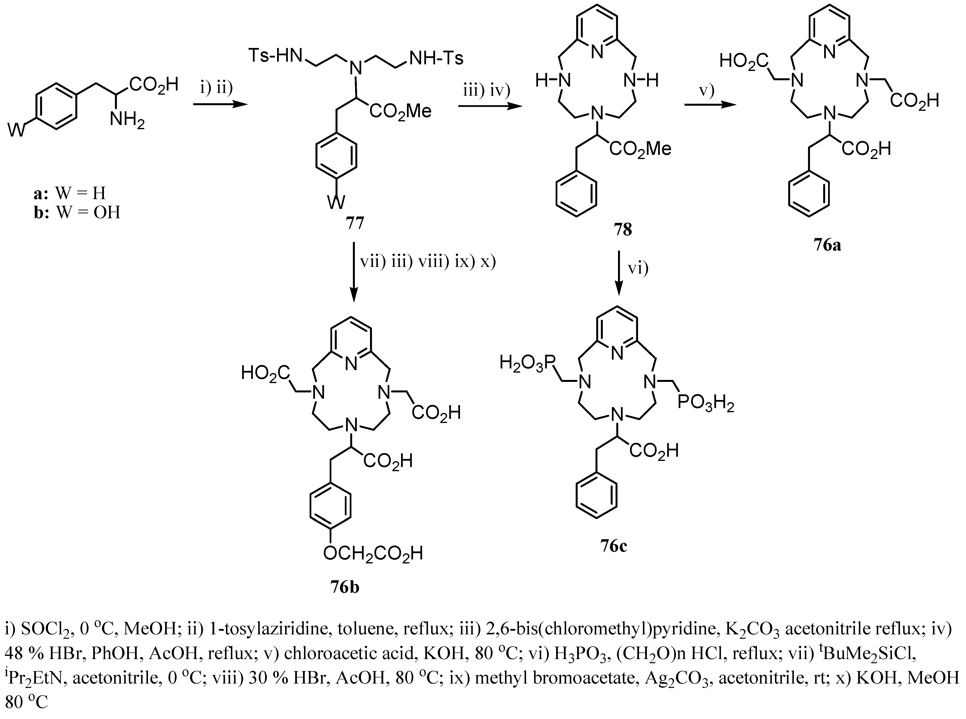 A similar synthetic route (Scheme 23) was used to obtain the macrocycles 76 starting from the corresponding amino acids [47]. Relaxivity of their Gd(III)-76a-c was 8.3, 10.5, and 8.1 s-1mM-1 at 20 MHz and 25 ºC, respectively, and in the range of the major of the heptadentate complexes. However, the inclusion of two phosphonate groups in 76c caused a decrease of the number of water molecules in the inner-sphere (q = 1) remaining two of those in second coordinating sphere (q2nd = 2). Esterification of the corresponding amino acid followed by reaction with two units of the N-tosylaziridine yielded compounds 77, which gave the corresponding macrocycles under the conditions mentioned above; deprotection of amine groups in 77a using acidic medium leaded to compound 78. While alkylation of the free amine groups in compound 78 using chloroacetic acid gave 76a, treatment of 78 with phosphoric acid and paraformaldehyde yielded 76c. Ligand 76b was synthesized from 77b in five steps as follow: i) protection of hydroxyl group, ii) formation of macrocycle, iii) deprotection of amine groups, iv) alkylation of those and hydroxyl using methyl chloroacetate and, v) basic hydrolysis.