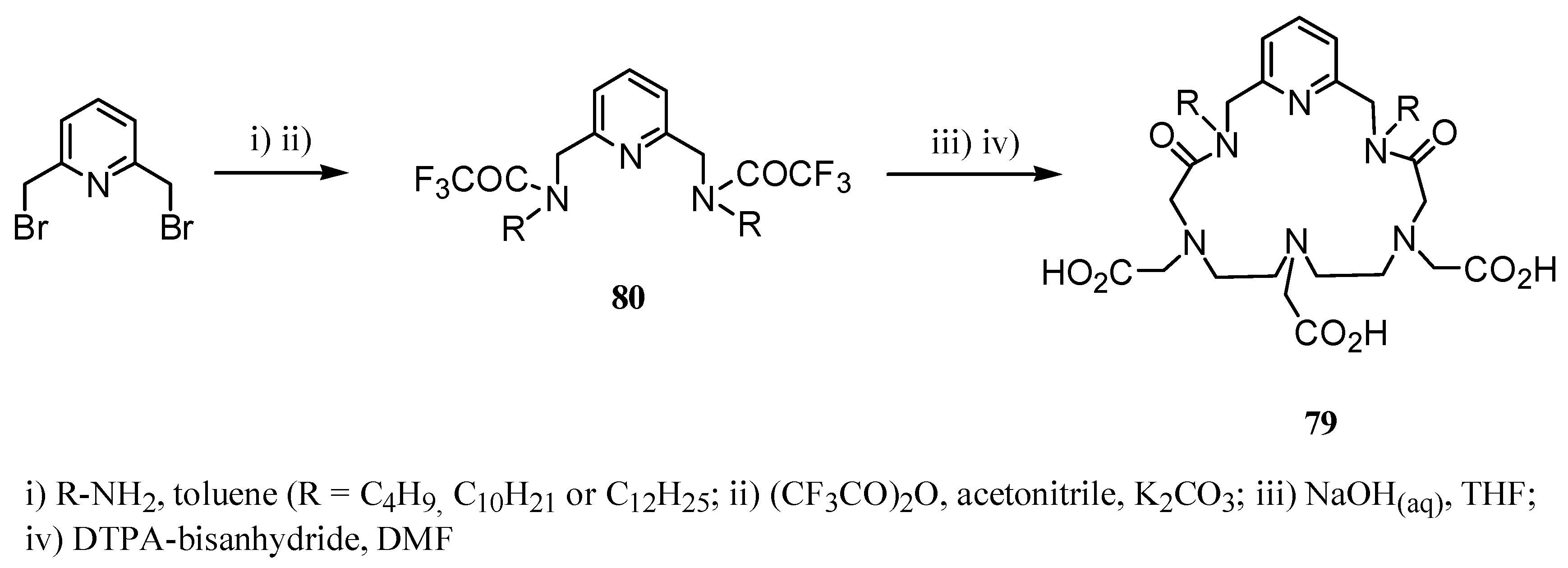 Zheng et al. [48] have developed new lipophilic macromolecular chelators of lanthanide ions 79 for in vivo applications. Some types of cells can be labeled with these complexes in order to visualize cell migration in different biological systems. Compounds 79 were prepared by reaction of bis(2,6-bromomethyl)pyridine and the corresponding amines and subsequent reaction with (CF3CO)2O to give compound 80, this last additional step being necessary to purify the corresponding amines (Scheme 24). Finally, treatment of 80 in basic medium and reaction of those with DTPA-bisanhydride afforded compounds 79.