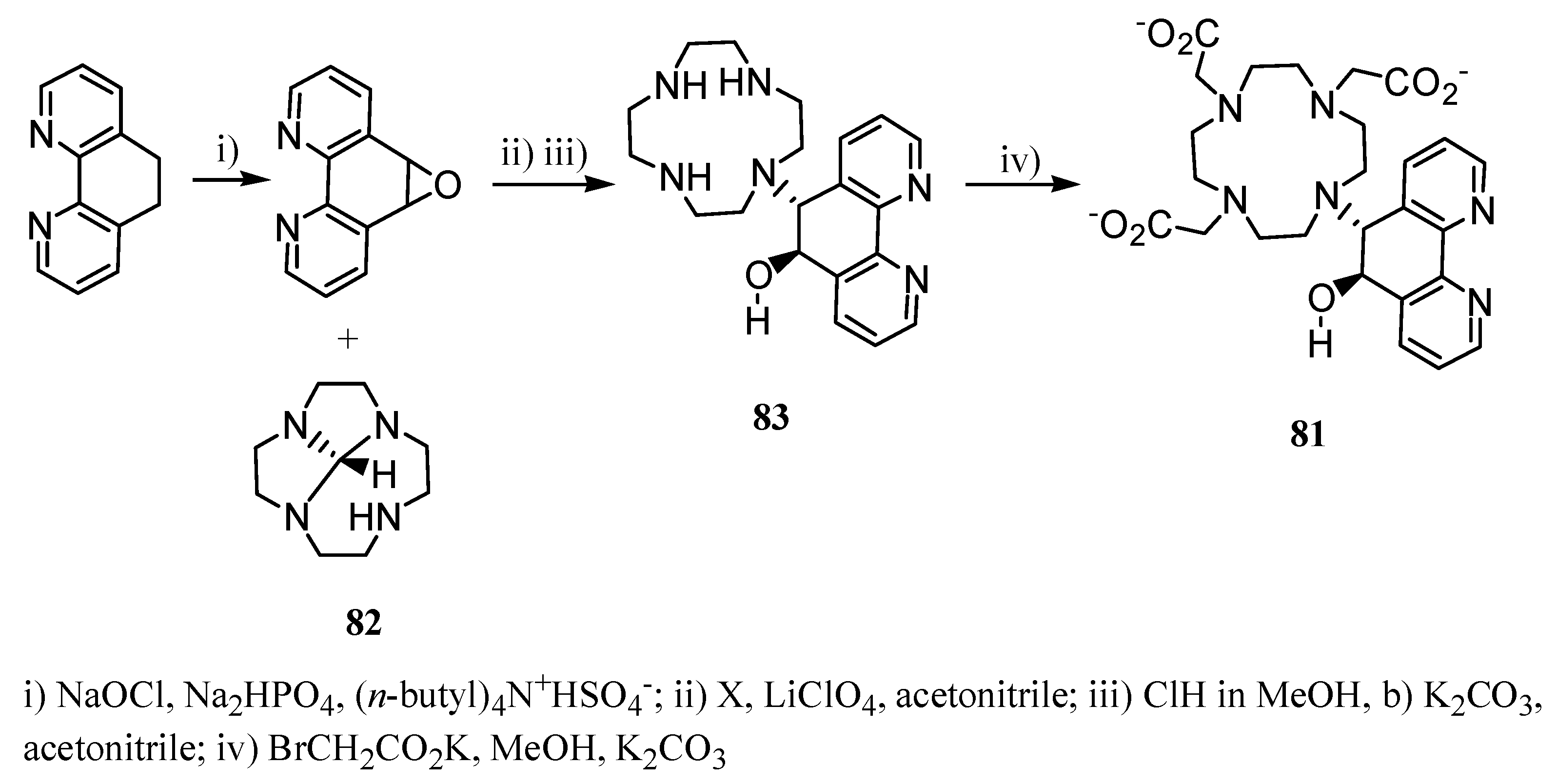 Ligand 81 was prepared from phenanthroline by epoxidation, subsequent reaction with cyclen derivative 82, followed by refluxing in HCl in MeOH affording compound 83. Finally, alkylation of 83 yielded the desired compound 81 (Scheme 25).