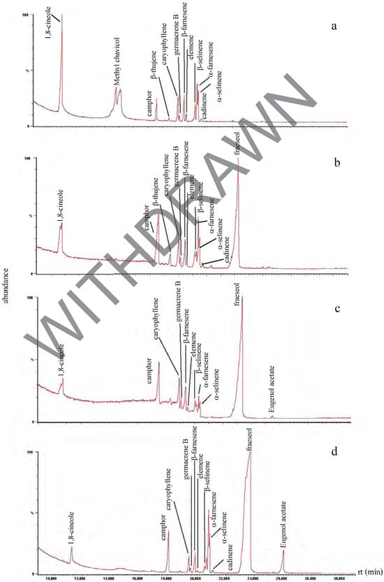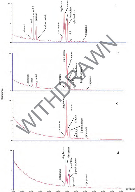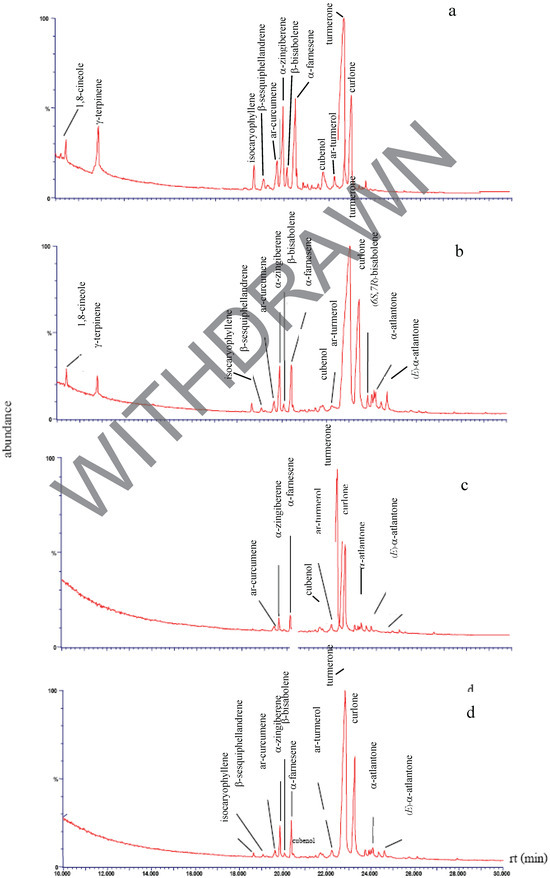 The GC-MS analysis results of turmeric are presented in Figure 3. Fifteen compounds were identified. The oil profile shows turmerone as the main compound (A: 50.0%, B: 58.5%, C: 66.7%, D: 64.7%); other major compounds were curlone, α-farnesene and α-zingiberene, respectively.