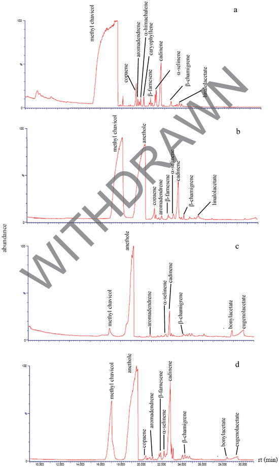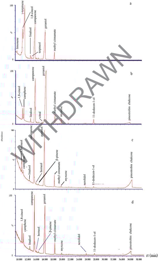 Volatile compounds in galangal extracts obtained by: (a) hydrodistillation (b) petroleum ether (c) secondary extraction with ethanol and (d) ethanol.