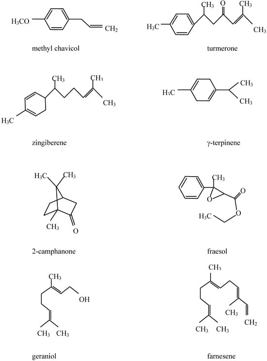 In summary, the major compounds in five Zingiberaceae essential oils (ginger, galangal, turmeric, kaempferia, bastard cardamom) were terpenes (zingiberene and farnescene; methyl chavicol and fraesol; tumerone, farnescene, and zingiberene; terpinene, geraniol, 2-camphanone and methyl chavicol, respectively, Figure 6), which display effects on membrane of bacteria (gram positive and negative).