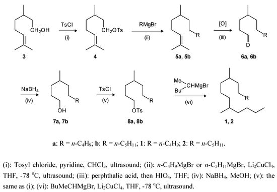 - Liang, T.; Kuwahara, S.; Hasegawa, M.; Kodama, O. Simple Synthesis of 5,9-Dimethylated Long-Chain Alkanes, the Sex Pheromones of Leaf Minor Moths. Biosci. Biotechnol. Biochem. 2000, 64, 2474–2477. [Google Scholar] [CrossRef] [PubMed]