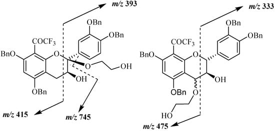 Mass spectral analysis of the three isolated compounds, conducted in the positive ion mode, showed signals located at m/z 807, 824, 829 and 845. These signals corresponded to [M+H]+, [M+NH4]+, [M+Na]+ and [M+K]+, respectively, and indicating a molecular weight of 806 amu. This result is in agreement with structures consisting of a tetrabenzylated moiety linked to a hydroxyethoxy group meaning that oxidation reaction has occurred in presence of DDQ. Since the three MS and UV data supported the conclusion that the three structures consisted of flavan-3-ol units linked to a HOCH2CH2O group, the primary problem was the establishment of the alkoxy location. Even if the mass spectra of the three compounds indicated the same molecular ions, some differences were observed in their fragmentation pattern. Thus signal peaks at m/z 393 and 415 were observed for compound 20a, while 20b and 20c showed signals at m/z 333 and 475 suggesting different alkoxyl group locations for these compounds shown in Figure 4.