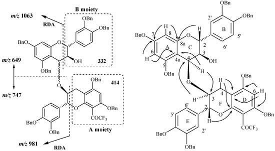 Through NMR analysis and in conjunction with the absence of a doubly benzylic methylene proton characteristic of a C4→C6 linkage and taking into account the dimeric structure of the compound as supported by MS analysis, the NMR data collectively indicated a dimeric structure with an interflavanyl ether bond connecting the two heterocyclic C and F rings. Taking into account the fact that the linkage did not involve the H2, H3, H4 F ring protons since they were all evidenced through NMR analysis, a (4-O-3) mode of linkage was thus concluded to occur between the two flavan-3-ols units. This was also confirmed by comparison of the chemical shifts of the H4 and H3 resonances of both the C and the F rings with those of their precursors. Finally the structure of compound was univocally confirmed through HMBC analysis where several long range correlations were observed. In particular correlations involving proton and carbon of both C and F rings via the oxygen atom were observed and confirmed thus the ether linkage involved in compound 24. Full assignment of the protons and carbon chemical shifts was achieved through HMBC analysis (Figure 5) where the main correlations involving H/C of the C and F rings were showed in agreement with the proposed structure.