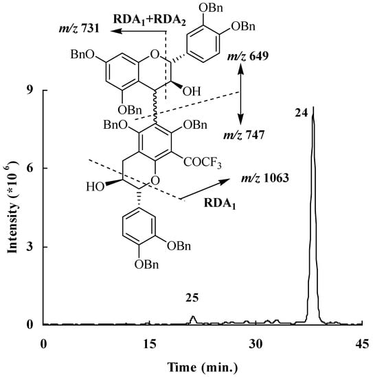 In order to verify the presence of other dimeric structures the mixture was explored by HPLC coupled to a mass spectrometry detection operating in the positive ion mode. An extracted ion current chromatogram recorded at m/z 1395 and 1412 (Figure 6) and corresponding to a dimeric structure molecular weight showed the presence, in addition to compound 24, of a minor compound, which is possibly the carbon-carbon coupled dimer 25. The fragmentations observed for compound 25 were in agreement with the proposed dimeric structure consisting of tetrabenzylated (+)-catechin 10 coupled to its trifluroacylated derivative 11 through a C4→C6 linkage (Figure 6).