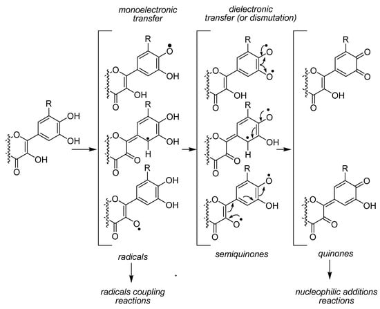 Through the enzymatic oxidation products of three flavonols, 36-38, we were able to prove the first oxidation to occur not on the phenolic functions but on the hydroxy group at C3, resulting in the major formation of C2 oxidized products. However, the presence of phenolic groups on the B ring is an important feature in the stabilizing of phenyl radicals, which can undergo coupling reactions. Moreover, when observed, these phenyl or phenoxyl radicals do not undergo dismutation since it would results in the formation of quinones (Figure 9), which would rather undergo nucleophilic addition reaction with other flavanol monomers, resulting in the formation of C2'(or C3')-C8(or C6) dimers as already reported in the literature in the case of flavan-3-ols [22].