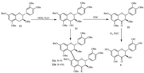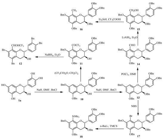 Compound 11 was prepared by action of trifluoacetic anhydride on tetrabenzylated catechin 10 following a Friedel-Craft’s reaction on the nucleophilic C-8 position, as previously described [14,15]. Further reduction by NaBH4 afforded compound 12. Compound 14 was prepared starting from the pentabenzylated catechin 13. After formylation through the classical Vilsmeier reaction, the obtained compound 14 was reduced by LiAlH4 giving the hydroxymethyl derivative 15. Further reduction of the latter gave the target product 16 with a good yield. The bromided adduct 17 was obtained from 13 by action of NBS. Gram-scale amounts of taxifolin (9) were prepared from (+)-catechin through reactions involving oxidation processes as previously described [17].