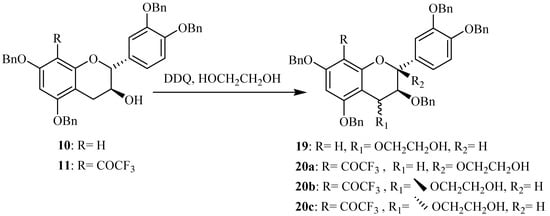 Oxidation at the benzylic C-4 position of flavanols constitutes a fundamental step in proanthocyanidin synthesis giving O-alkylated adducts. The use of DDQ [15,16] as oxidant of tetrabenzylated catechin 10 in presence of ethylene glycol gave the corresponding 4-O-alkylated catechin 19 with good yields attaining 70 %, as indicated in our previous work [14] (Scheme 2).