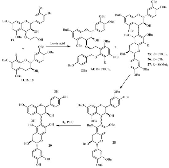 The obtained results discussed above showed that the interflavanic carbon-carbon linkage formation was largely inhibited during Lewis acid induced flavanols coupling reactions by the presence of an electron-withdrawing group, while this was not the case with an electron-donor group like the methyl substituent. This could constitute thus a setereoselective method for the formation of C4→C6 procyanidin dimers which are usually obtained as minor compounds the C4→C8 ones. In order to apply this technique to the stereoselective preparation of natural dimeric procyanidin of the C4→C6 type, we unsuccefully tried to remove the methyl group from the modified derivatives 26. Then we used the trimethylsilyl group which is easily removable by hydrolysis. Indeed, during purification of compound 18 on silicagel chromatography column, we saw that this compound was easily transformed to 10 by loss of the 8 substituent group. This prompted us to use this compound as nucleophile acceptor unit in the Lewis acid coupling reaction. The reaction was monitored through TLC and LC-MS, showing the presence of compound with a molecular mass of 1460 amu corresponding to the dimeric compound 27. After hydrolysis and hydrogenolysis, the corresponding product 29 was separated and analyzed through mass spectroscopy. The obtained results indicated a molecular mass of 578 amu in agreement with the dimeric structure of compounds 29. Indeed, the mass spectrum of compound 29 showed procyanidin characteristic RDA fragmentation giving an ion fragment by a loss of 152 mass units. We tried to proof the interfalvanic linkage of the obtained compound through 2D NMR technique, but due to degradation of the obtained compound, our attempt was unsuccessful.