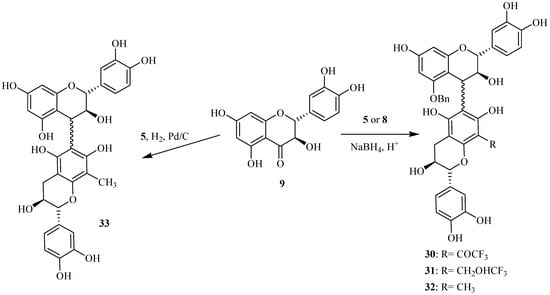 When the reaction was assayed with compound 8, new compounds showing a mass signals at m/z 673 and 675 in the negative ion mode were detected. These compounds were interpreted as the dimeric modified procyanidins 30 and 31, formed by action of the carbocation cat+ on the 8-substituted catechin compounds used as nucleophile units. The cat+ unit is issued from the reduction of taxifolin into a flavan-3,4-diol, followed by protonation and dehydration. The action on compound 8 gave thus the dimer 30 while compound 31 was formed after reduction of the carbonyl group by NaBH4 and further action of the cat+ adduct. This was confirmed by detection of compound giving a signal peak at m/z 591 corresponding to the reduced 8-substituted monomer. The same reaction was investigated using the 5 monomer and the corresponding methylated dimer 32 was detected through LC-MS analysis.