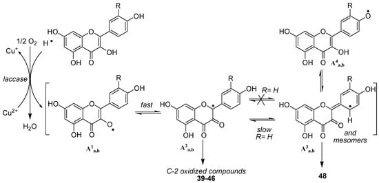 The first feature arising from our study was the non-oxidation of both 34 and 35, thereby confirming the crucial role of the 3-OH group in the oxidation process. Moreover, this first result also showed that the presence of an highly reactive catechol type B-ring is not sufficient to allow a one-electron oxidative process to occur, also reflecting the postulated important role (DFT study) [46,47] played by the hydroxy group at C3 in the first steps of oxidation of flavonols.