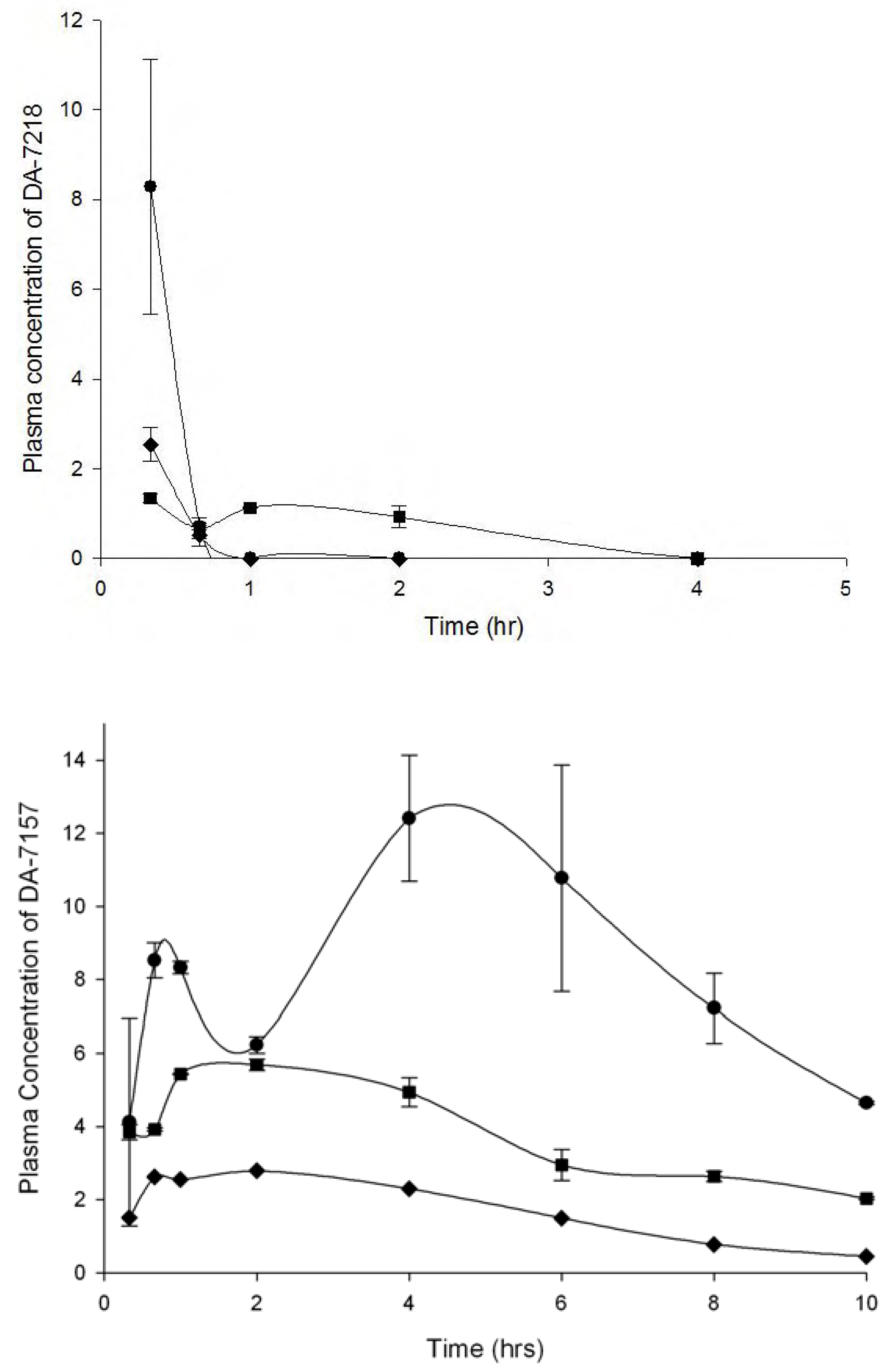 - Mean plasma levels of DA-7218 and DA-7157 in BALB/c mice at dose of 5 (♦), 12.5 (■), and 25 mg/kg (●). Three animals were bled at each point, and the concentration of DA-7218 or DA-7157 was determined by HPLC as described in the experimental section. The bar corresponds to the standard deviation