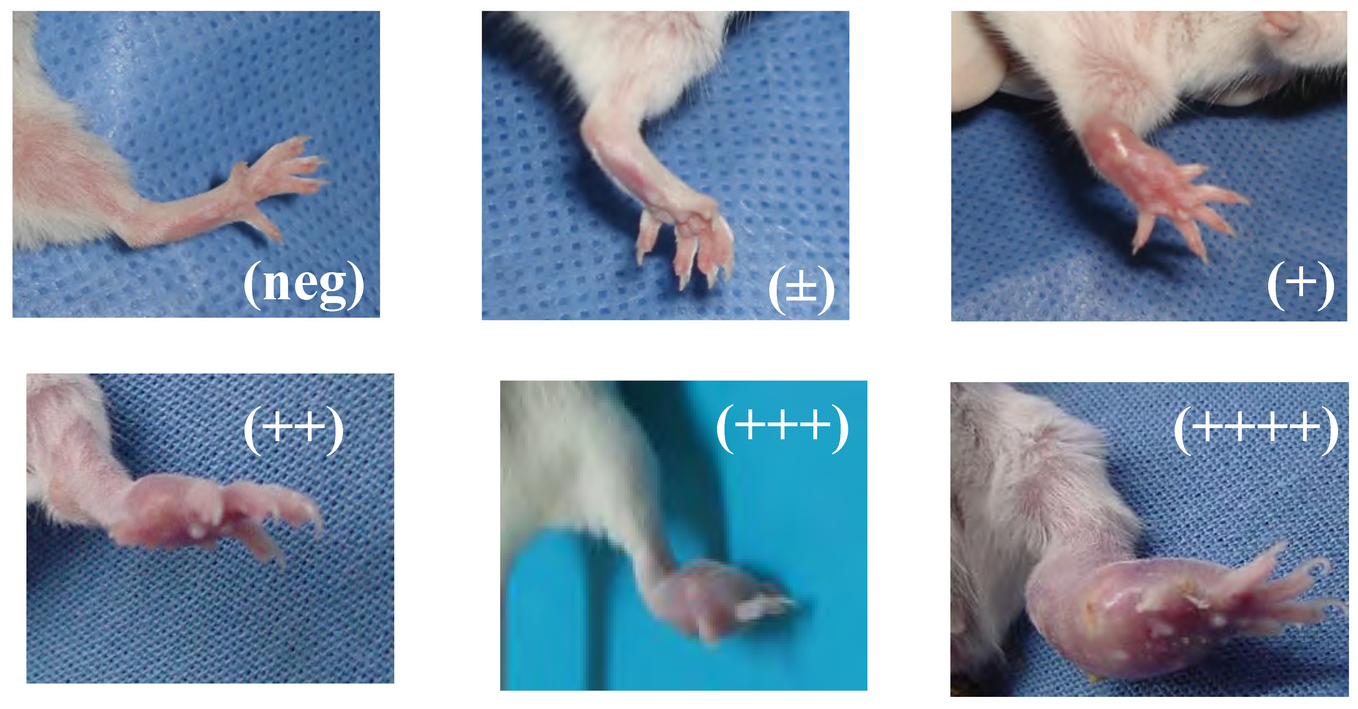 BALB/c mice inoculated with N. brasiliensis HUJEG-1 showing diverse degrees of mycetomatous lesions. The lesions were scored from those without inflammatory changes (identical to the non-inoculated foot pad), to those presenting extense, abscedated lesions over the metatarsal bone.