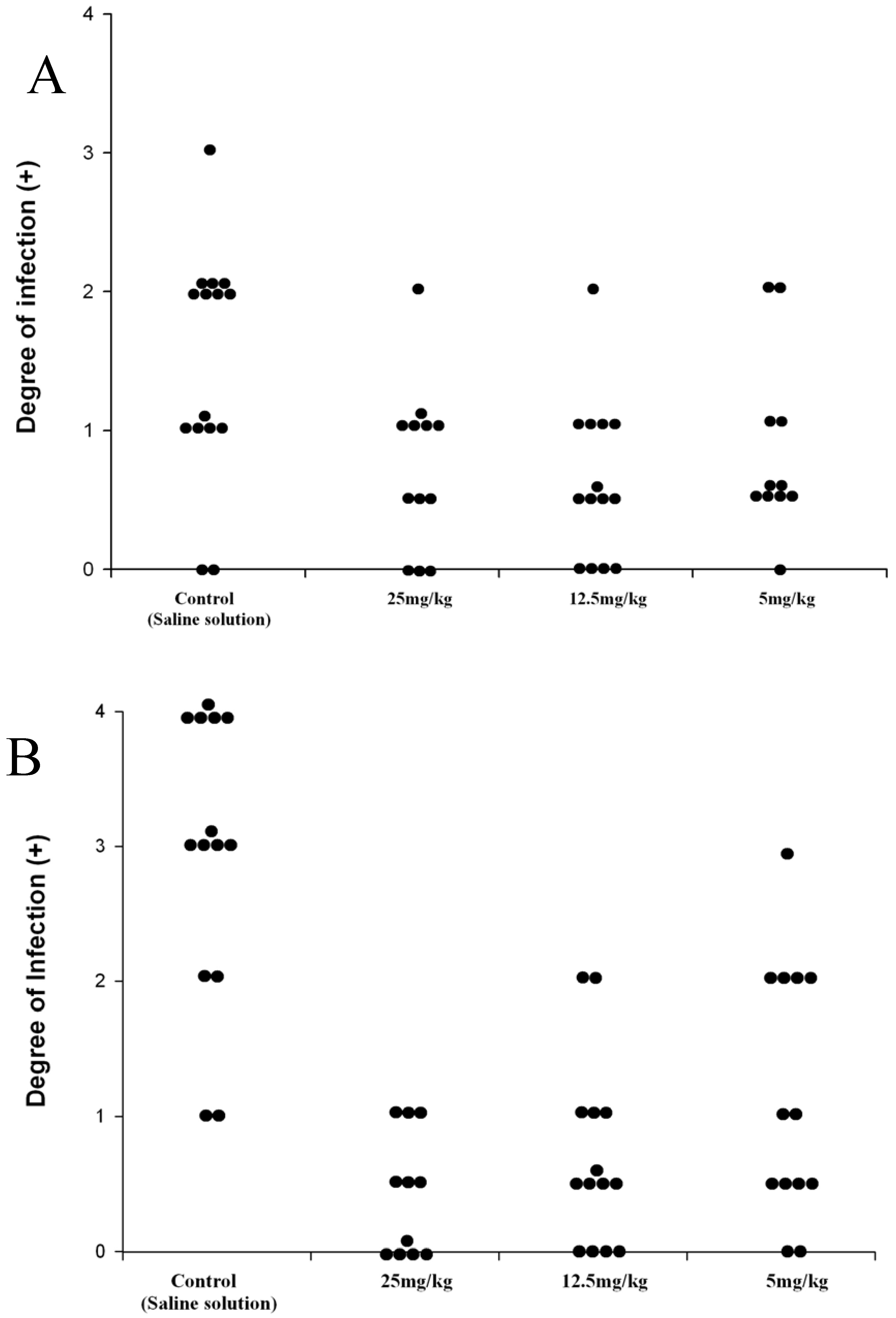Effect of the prodrug, DA-7218 on the development of mycetomatous lesions on BALB/c mice infected with N. brasiliensis. A: Degree of infection of mice footpad after 3 weeks of therapy. B: Scores after the second cycle of three weeks of therapy. Each point represents the score of one animal.