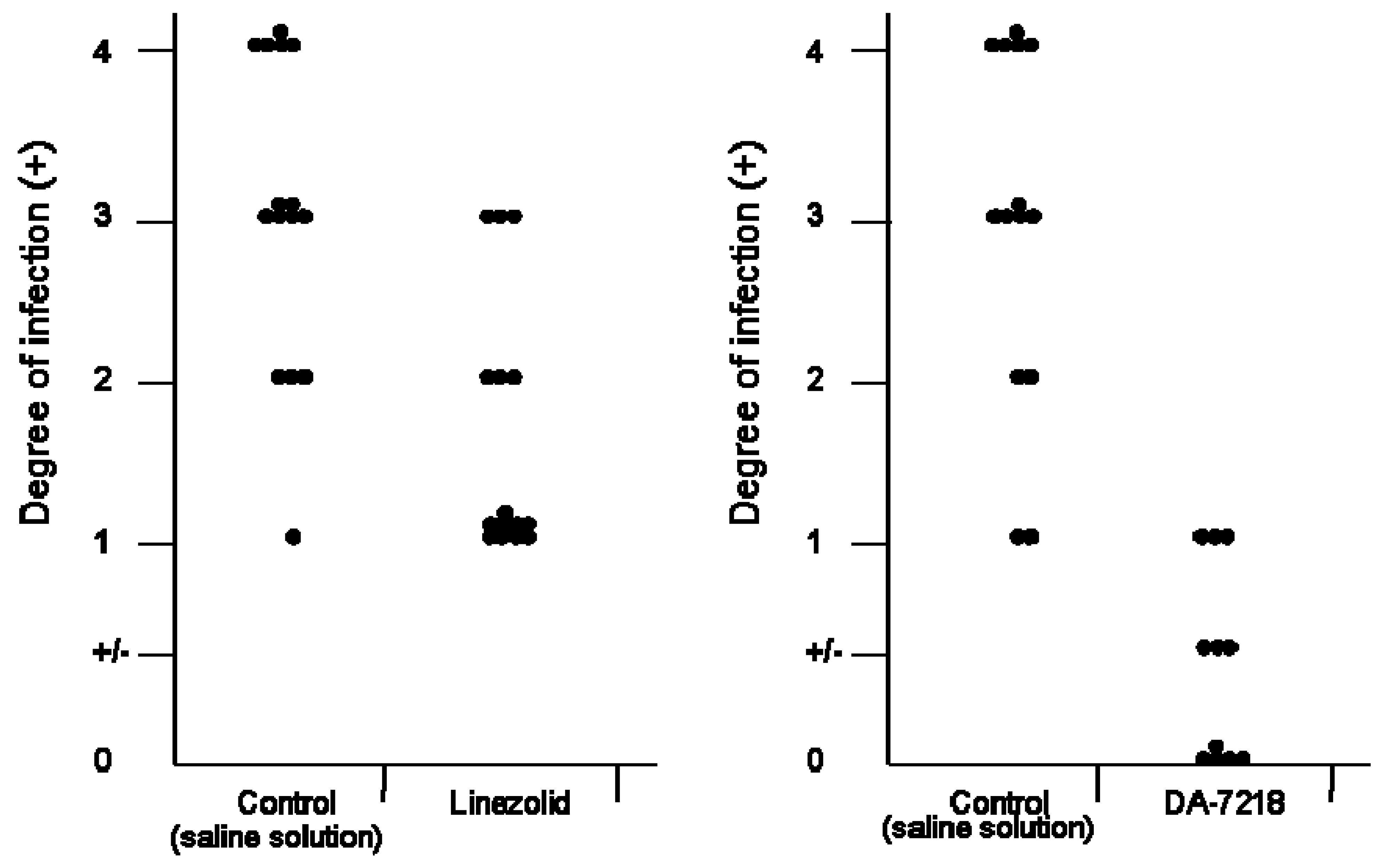 Comparison of the in vivo effects of linezolid and DA-7218. In both cases the antimicrobials were applied subcutaneously at 25 mg/kg, Left, linezolid; right, DA-7218. Each point represents one mouse.
