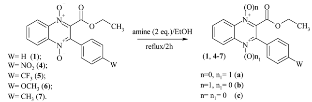 Quinoxaline and quinoxaline 1,4-di-N-oxide are heterocycles that are often used in the synthesis of biologically active compounds [,,,,,,,,,,,,,,,,,,,,,,,,,,,,,,]. The former is described as a bioisoster of the quinoline, naphthyl, benzothienyl and other aromatic rings [], and it can be found in the structure of anti-bacterial [], anti-tuberculosis [,,,,,,,,,], anti-cancer [,,,], anti-malarial [,,,,,], anti-Chagas [,] and anti-inflammatory [,] drug candidates. The widespread activity of quinoxaline 1,4-di-N-oxides can be associated with the generation of free radicals []. In our continuing efforts to find quinoxaline-1,4-di-N-oxide derivatives with anti-malarial activity [,,,,,,], the conversion of compound 1 into hydrazides 2 and amide derivatives 3 was carried out by means of hydrazinolysis and aminolysis reactions, in which unexpected results were obtained. In this work we describe the reducing profiles of amine derivatives when they act upon the ethyl 3-phenylquinoxaline-2-carboxylate 1,4-di-N-oxide derivative 1.