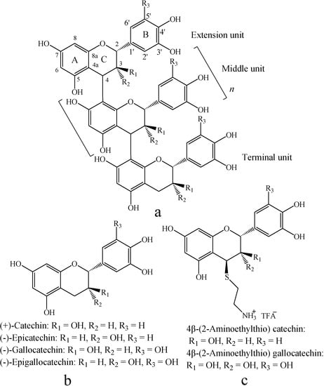 Structures of proanthocyanidins polymer (a), monomeric flavan-3-ol (b), and their aminomethylthio derivatives (c).