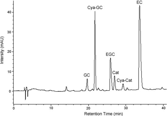 Reversed-phase HPLC chromatograms of condensed tannins from L. glaber leaves degraded in the presence of cysteamine; EC, (-)-epicatechin; Cat, (+)-catechin; EGC, (-)-epigallocatechin; GC, (-)-gallocatechin; Cya-Cat, 4β-(2-aminoethylthio)catechin; Cya-GC, 4β-(2-aminoethylthio) gallocatechin.