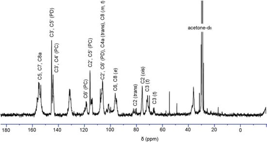 13C-NMR spectroscopy has been employed to examine the nature of polymeric condensed tannins [4]. The 13C-NMR spectra of condensed tannins present information on the absolute and relative stereochemistry of the heterocyclic ring (C2–C3), the structures of the chain terminating flavan-3-ol units, the ratio of procyanidin (PC) to prodelphidin (PD) extension units, and the number average molar mass (Mn), according to Czochanska et al. [21].