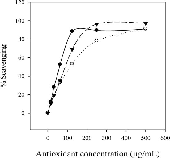 Percentage of free radical scavenging activity of condensed tannins, BHA and ascorbic acid. ●, condensed tannins of L. glaber; ○, BHA; ▼, ascorbic acid.
