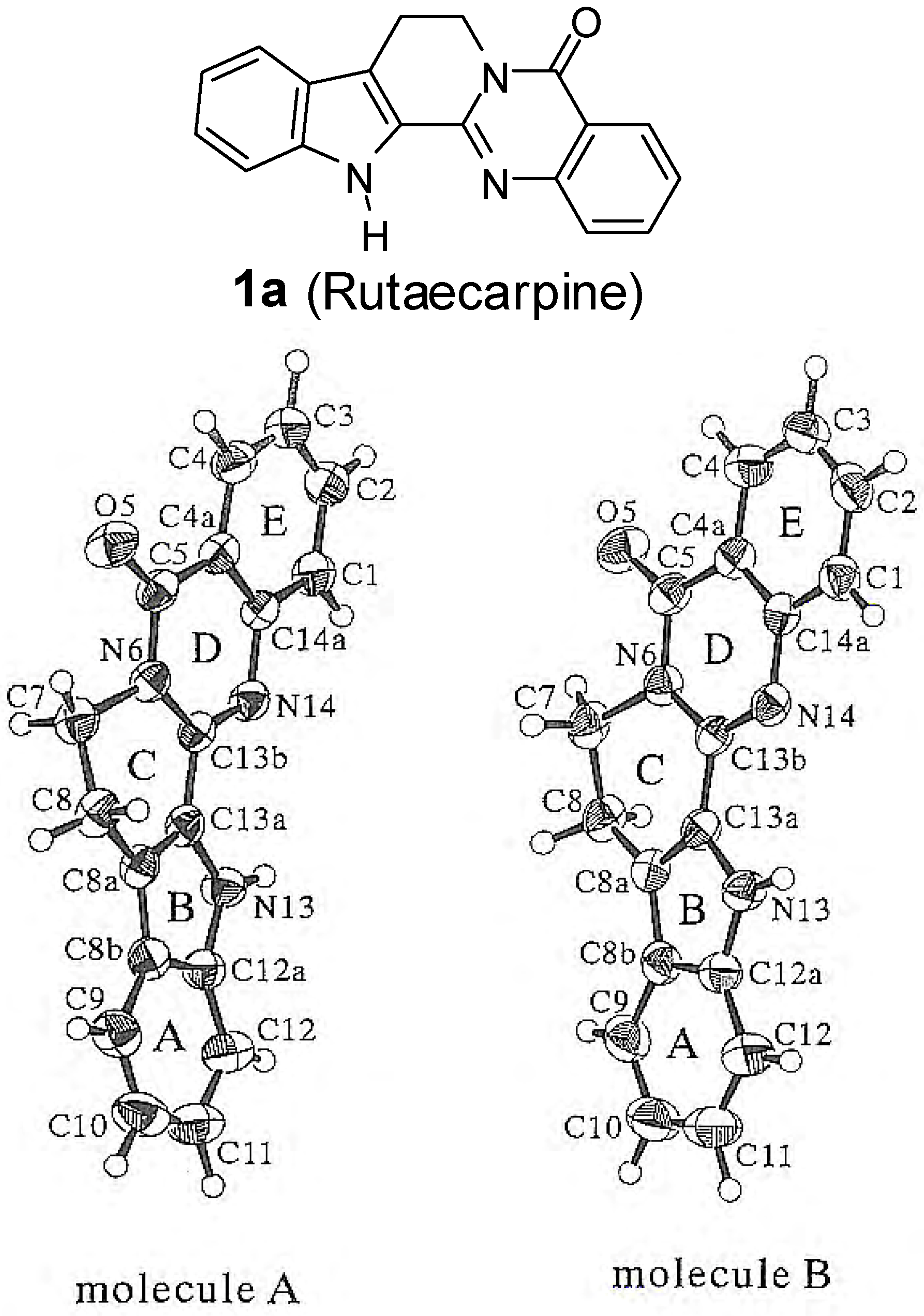 The structure of rutaecarpine was determined by degradation methods [3]. Hydrolysis of rutaecarpine with KOH in amyl alcohol afforded anthranilic acid, while fusion with KOH yielded aniline, CO2, NH3 and indole-2-carboxylic acid [3]. Later infrared [5], ultraviolet spectroscopy [6], mass spectrometry [7], 1H-NMR [8] and 13C-NMR [8] spectroscopy were employed to confirm the structure. Finally, the molecular structure was confirmed by X-ray analysis by Fujii, Kobayashi and Hirayama [9], who reported that rutaecarpine (C18H13N3O) gave monoclinic crystals, P21/a, a = 26.909(1) Å, b = 7.398(1) Å, c = 14.468(1) Å, β = 98.672(5)o, V = 2847.3(4) Å3, Z = 8. It should be noted that rutaecarpine exists in two forms. The X-ray crystallographic structure of rutaecarpine is an essentially planar structure in which rings A and B as well as rings D and E are coplanar and ring C has a half-chair conformation, which can undergo a ring flip, thus having dihedral angles between the two coplanar rings (co-plane A-B vs D-E) of 6.20° and 6.45°, for forms A and B, respectively (Figure 1).