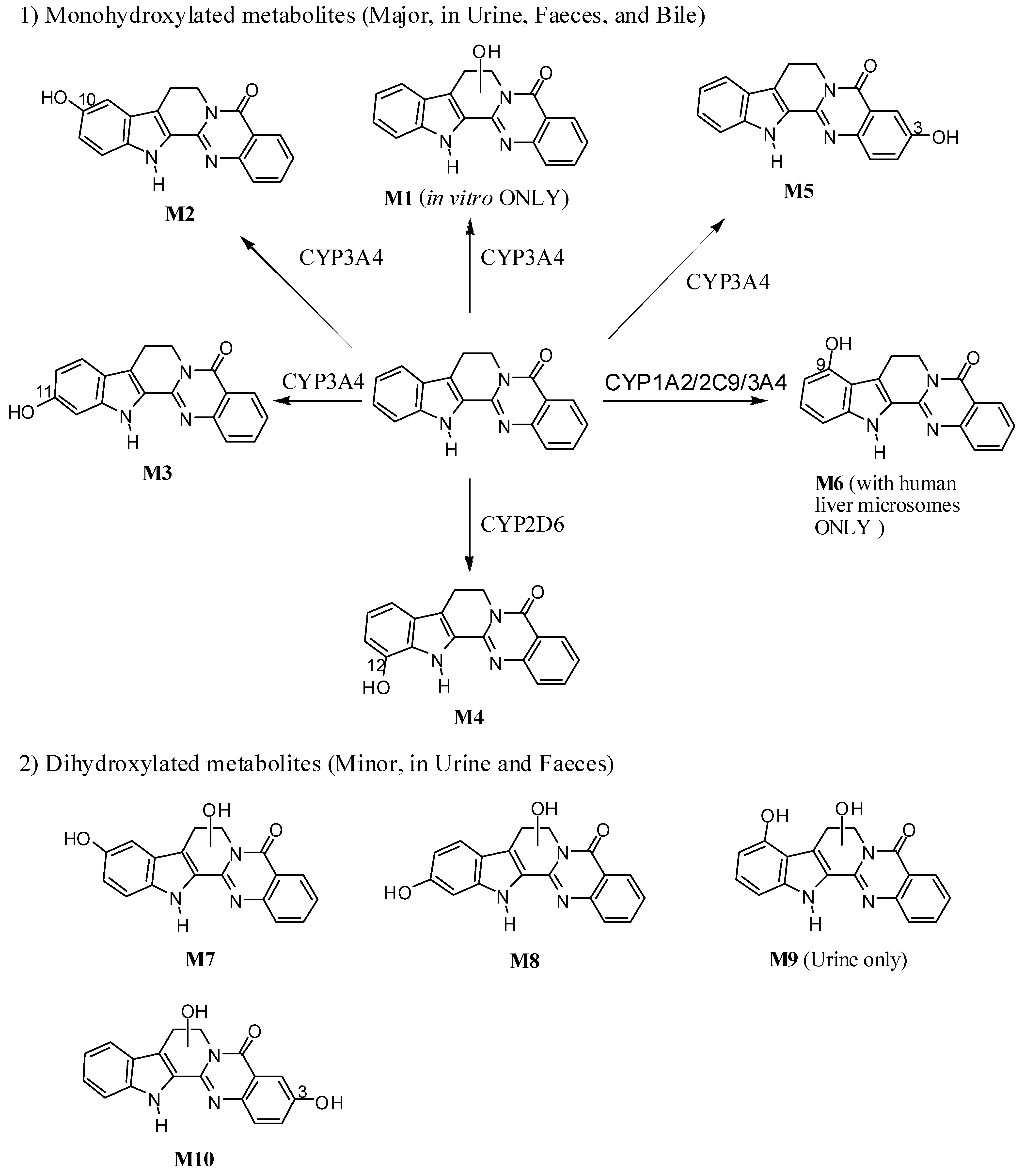 - Ueng, Y. F.; Don, M. J.; Jan, W. C.; Wang, L.-K.; Chen, C. F. Oxidative Metabolism of the Alkaloid Rutaecarpine by Human Cytochrome P450. Drug. Metabol. Dispos. 2006, 34, 821–827. [Google Scholar] [CrossRef]