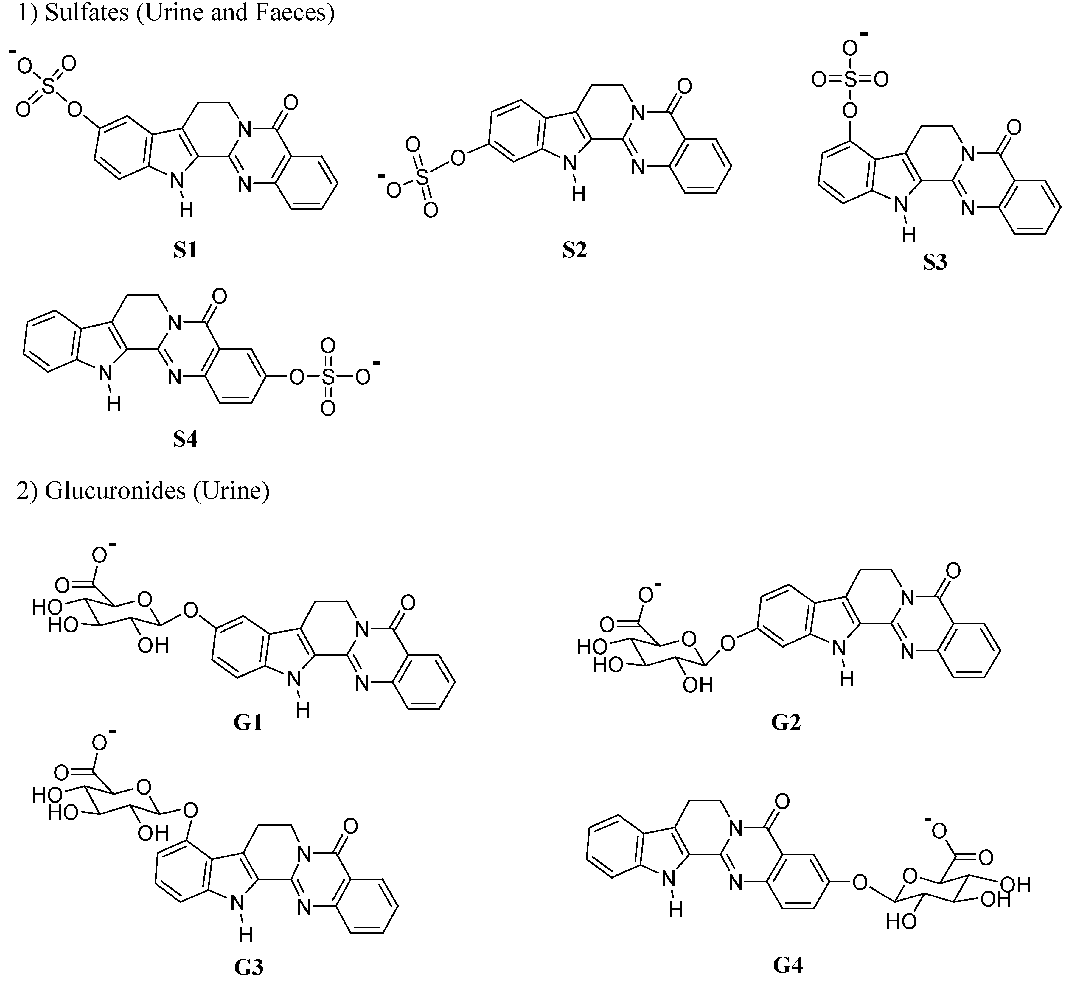 Recently, two indolopyridoquinazoline alkaloidal glycosides, 11-O-β-D-glucopyranosyl rutaecarpine (ternatoside C) and 11-O-α-L-rhamnosyl-(1-6)-β-D-glucopyranosyl rutaecarpine (ternatoside D) were isolated from the roots of Ranunculus ternatus (Ranunculaceae) [56]. However, to our surprise, the corresponding hydrolyzed product of ternatoside C and/or D, 11-hydroxyrutaecarpine, has never been isolated as yet from the natural sources even though it is an isolated metabolite of cytochrome P450-catalyzed oxidative metabolism of rutaecarpine (vide infra).