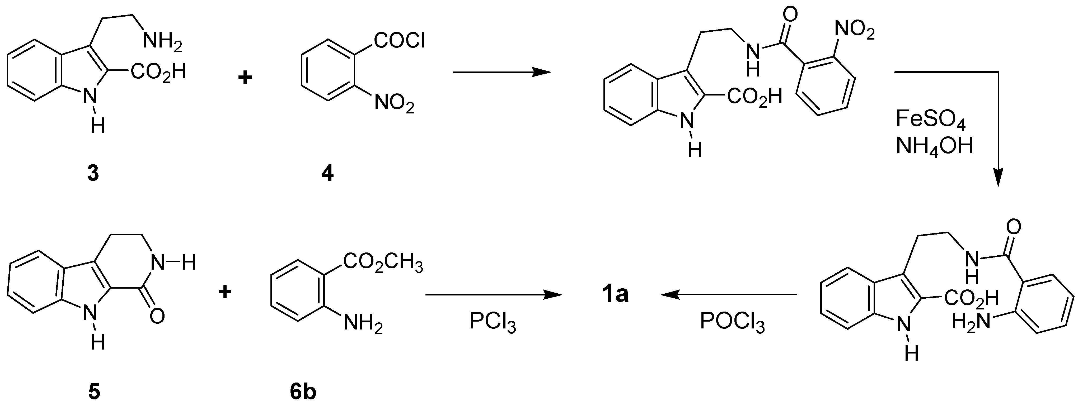These two papers provided a good starting point for the future syntheses of rutaecarpine as these two sets of starting materials, 3-(2-aminoethyl)indole-2-carboxylic acid (3) and 2-nitrobenzoyl chloride (4) as well as 2,3,4,9-tetrahydro-1H-pyrido[3,4-b]indol-1-one (5) and methyl anthranilate (6b), have been employed as starting materials for the most of consequent rutaecarpine synthesis.