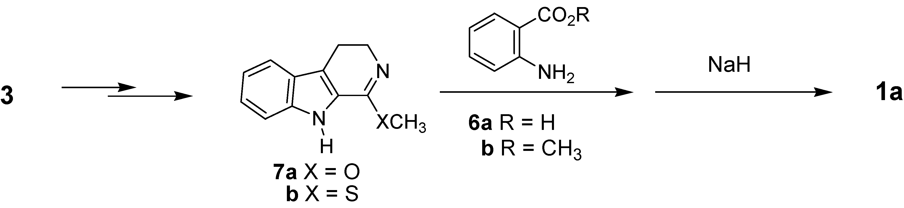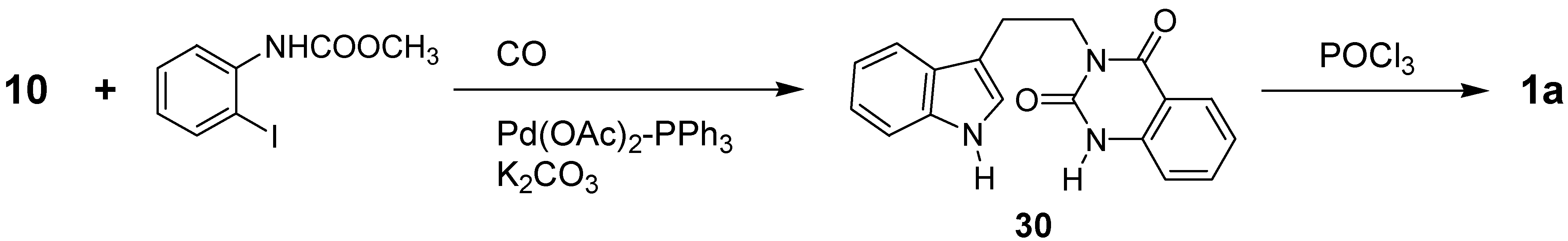 - Eguchi, S.; Takeuchi, H.; Matsushita, Y. Synthesis of Novel Carbo- and Heteropolycycles. 20. Short-Step Synthesis of Rutecarpine and Tryptanthrin via Intramolecular Aza-Wittig Reaction. Heterocycles 1992, 33, 153–156. [Google Scholar] [CrossRef]