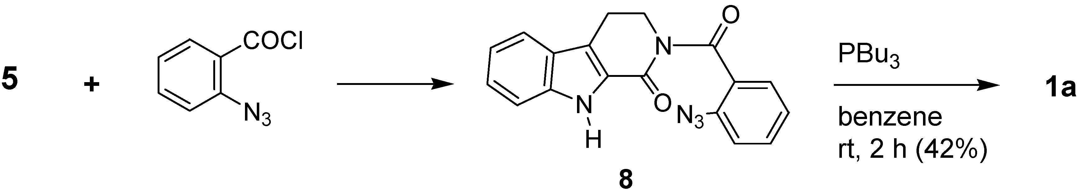 Eguchi et al. used an aza-Wittig reaction in the presence of tributylphosphine for the construction of ring D from 2-(2-azidobenzoyl)-2,3,4,9-tetrahydro-1H-pyrido[3,4-b]indol-1-one (8) [64] (Scheme 3).