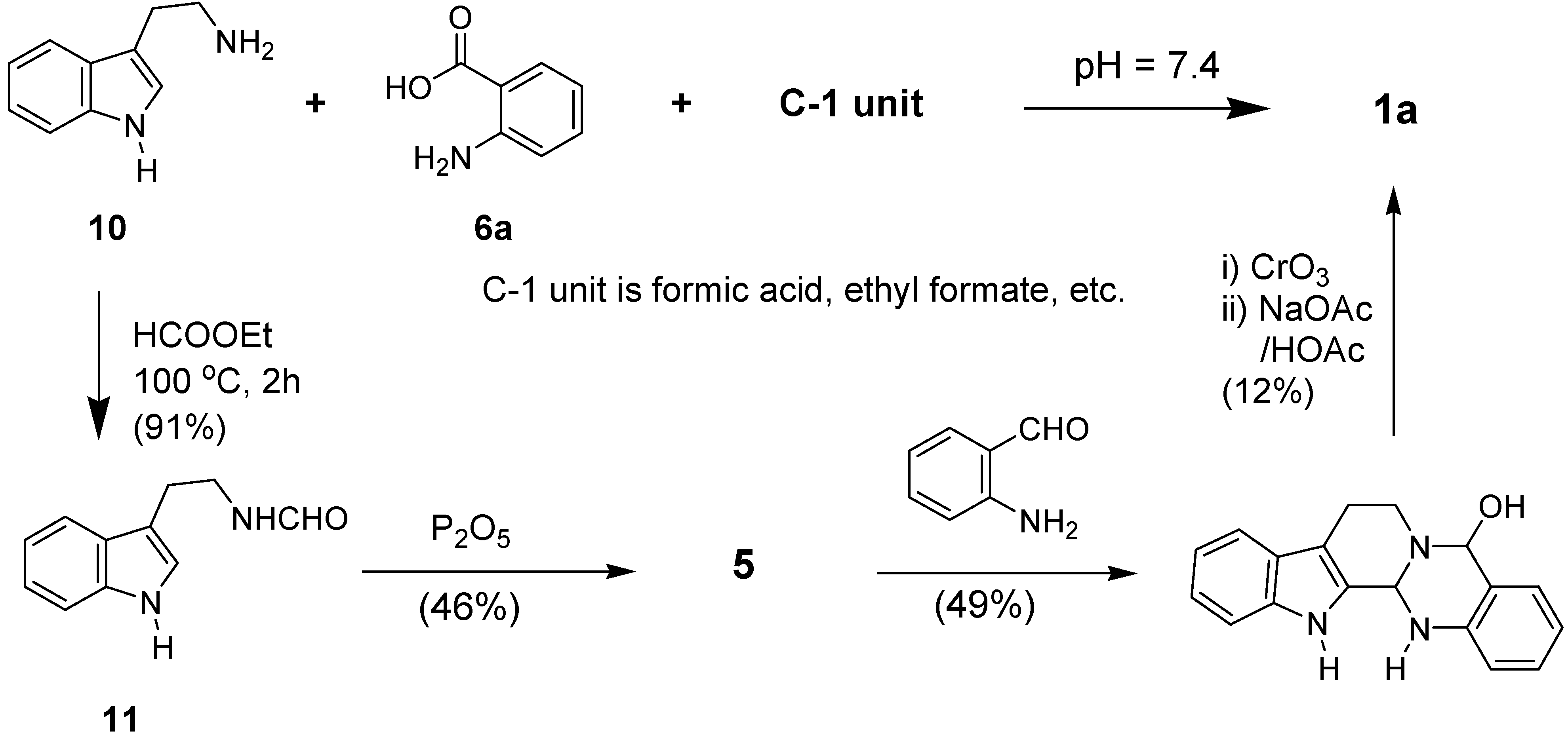 Asahina et al. reported two papers for the synthesis of rutaecarpine in 1927: one covered three-step synthesis from 3-(2-aminoethyl)indole-2-carboxylic acid (yield not given) (3) [57] and the other one-pot synthesis (24%) from ketotetrahydrocarboline (5), methyl anthranilate (6b), and PCl3 [58] (Scheme 1). Later, Patcher et al. claimed that PCl3 was inefficient and POCl3 should be preferred reagent [22a].