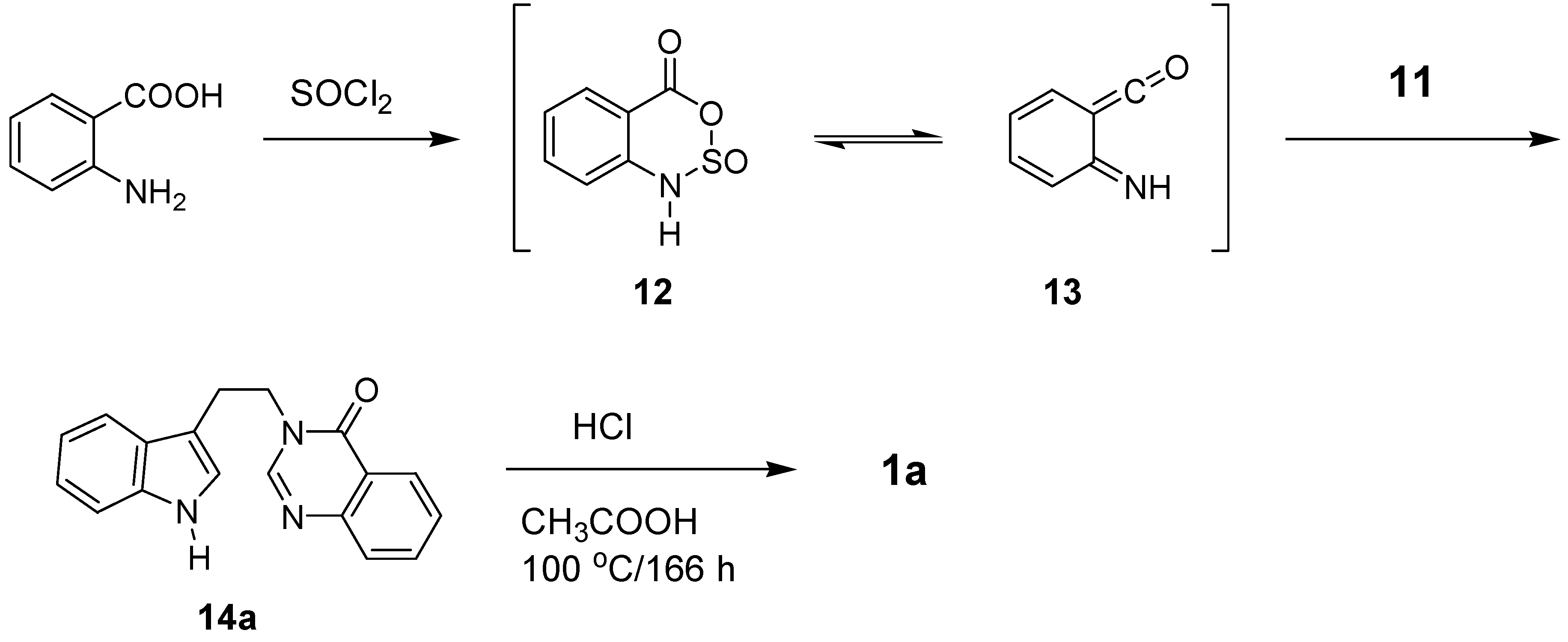 - Wang, C.-L.; Liu, J.-L.; Ling, Y.-P. Progress in the Synthesis of Rutaecarpine. Chin. J. Org. Chem. 2006, 26, 1437–1443. [Google Scholar] Kollenz, G. Product Class 10: Imidoylketenes. Sci. Synthesis 2006, 23, 351–380. [Google Scholar] Kikelj, D. Product Class 13: Quinazolines. Sci. Synthesis 2004, 16, 573–749. [Google Scholar] Witt, A.; Bergman, J. Recent Developments in the Field of Quinazoline Chemistry. Curr. Org. Chem. 2003, 7, 659–677. [Google Scholar] Bergman, J. The Quinazolinocarboline Alkaloids. In Alkaloids – Chemistry and Pharmacology; Brossi, A., Ed.; Academic Press: New York, 1983; Vol. XXI; pp. 29–54. [Google Scholar] See also Mhaske, S. B.; Agrade, N. P. The Chemistry of Recently Isolated Naturally Occurring Quinazolinone Alkaloids. Tetrahedron 2006, 62, 9787–9826. [Google Scholar]