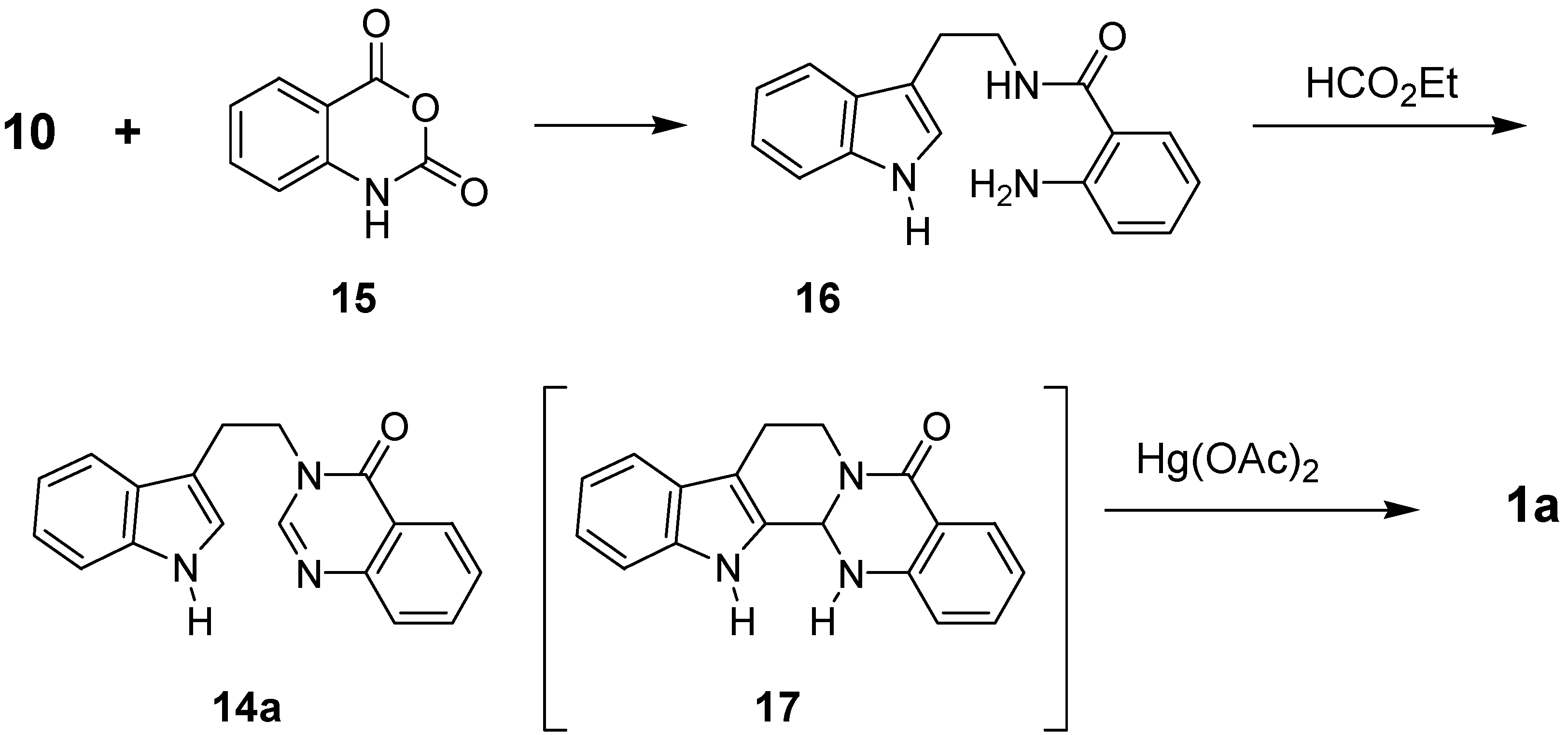 Condensation of tryptamine with isatoic anhydride (15) led to N-(2-aminobenzoyl)tryptamine (16). Although Horvath-Dora and Clauder claimed that reaction of 16 with triethyl orthoformate afforded 13b,14-dihydrorutaecarpine (17) [69b], the real structure of the product was corrected by Bergman and Bergman [8b,70] to be 14a (Scheme 7). The structure of 17 was further confirmed by isolation from Zanthoxylum flavum [71] and Evodia rutaecarpa [72], as well as chemical synthesis [72].