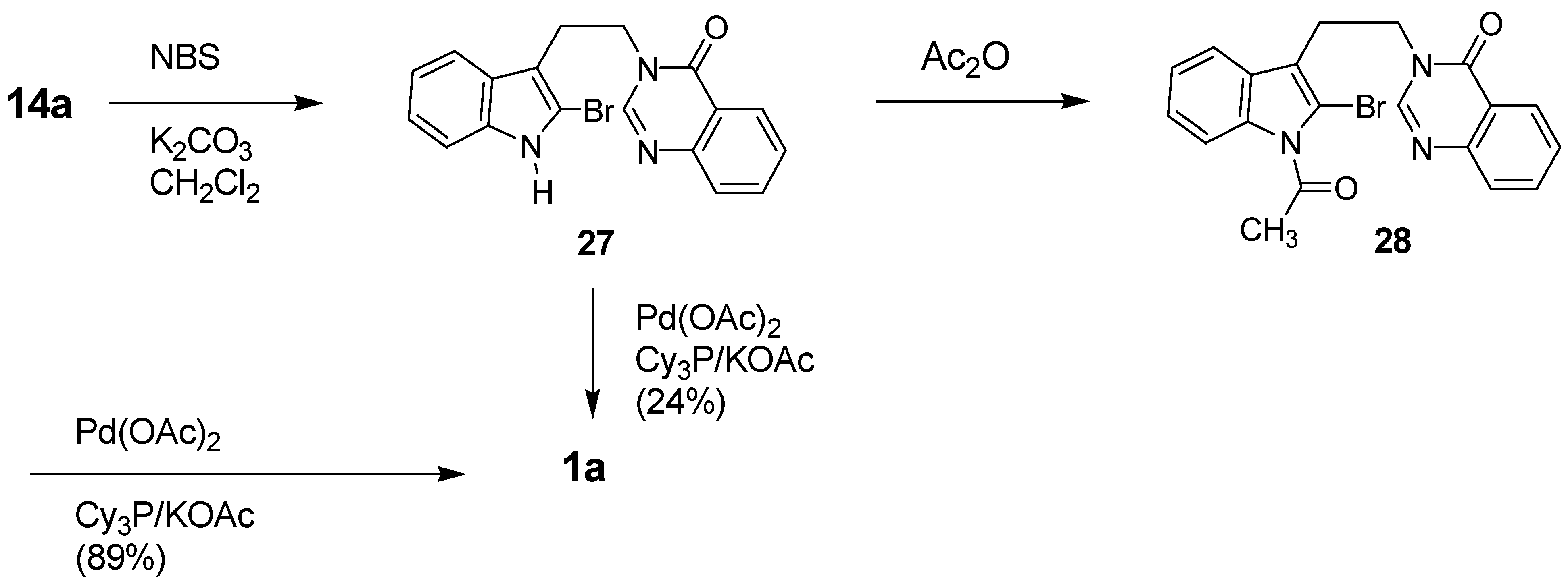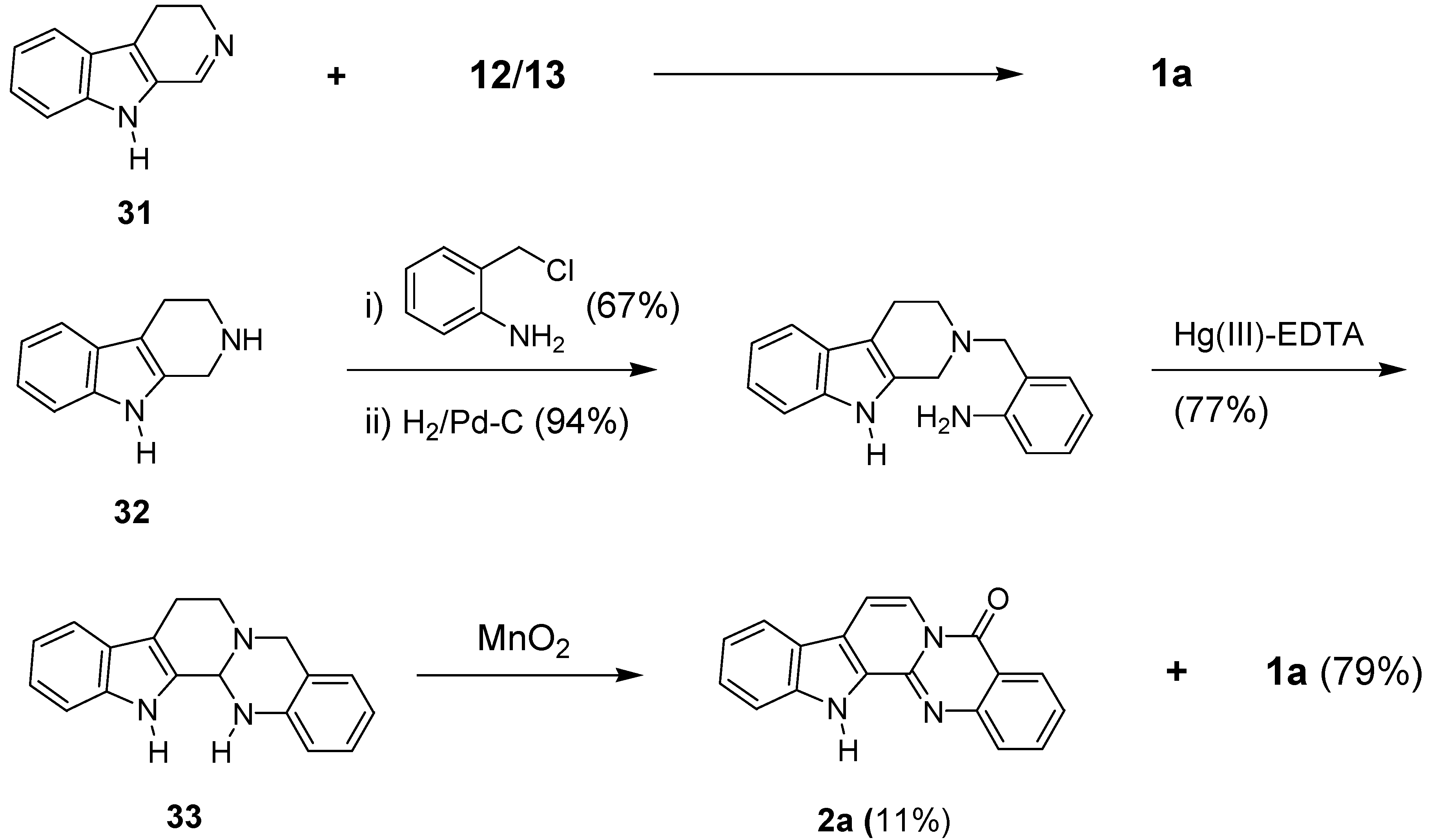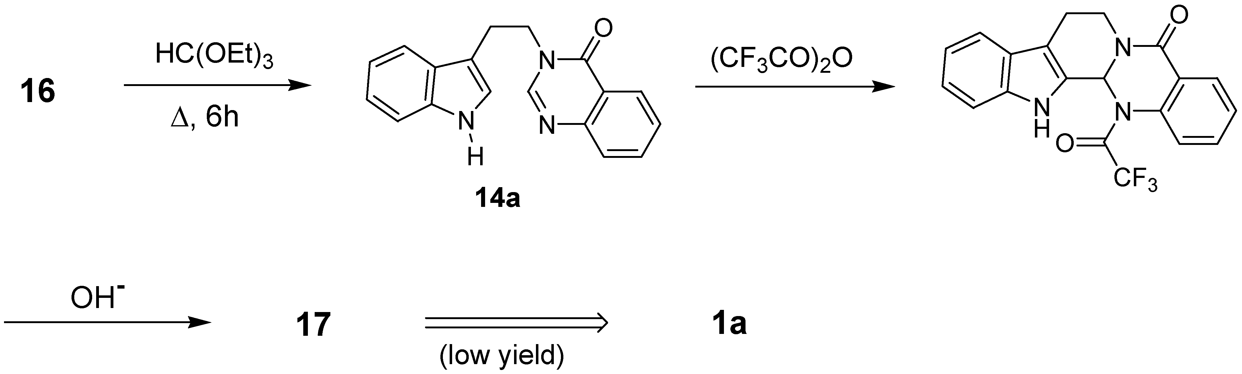 Bergman and Bergman additionally introduced a modified procedure for the preparation of 14a by reacting N-(2-aminobenzoyl)tryptamine (16) with triethyl orthoformate in 89% yield [8b]. Attempts to convert 17 directly to rutaecarpine (1a) using oxidative coupling reagents such as Hg(OAc)2, FeCl3, and Pb(OAc)2 were rather indiscriminate and resulted complex reaction mixtures (Scheme 8).
