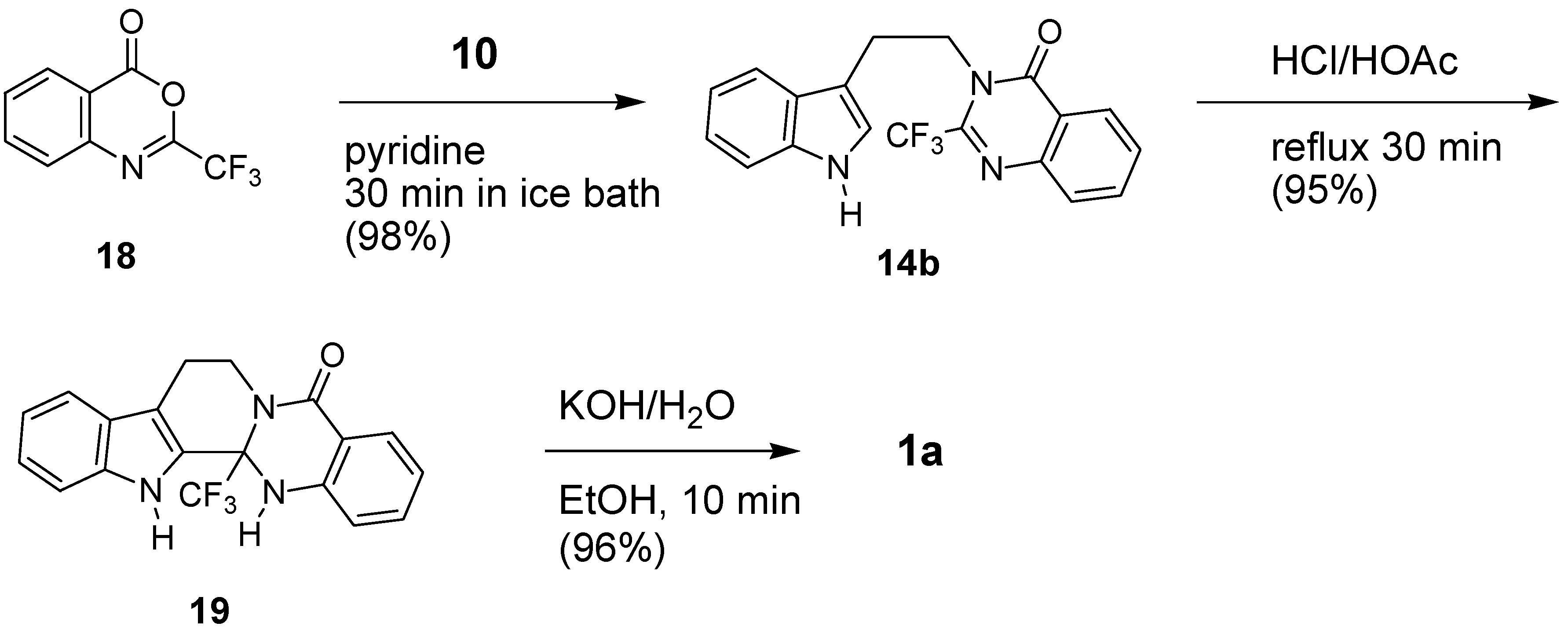 A rationale to improve the conversion of 14a to rutaecarpine could be to introduce a good leaving group at C2 of either the 4(3H)-quinazolinone or the indole ring. The introduction of a good leaving group such as CF3 at C2 of quinazolinone ring would not only facilitate the acid-catalyzed ring closure of 14b to the pentacyclic intermediate 19, but would also act as a leaving group in the final step [70]. Reaction may proceed by protonation of the 4(3H)-quinazolinone moiety of 14b, followed by electrophilic attack on the indole ring leads to 19, which has an angular CF3 group in the 13b-position. The reaction time required for the three steps is less than 1 h, the reaction temperature is approximately 150 oC, and the yield for each step is over 95%. This procedure has been applied for the introduction of various substituent(s) on ring A to pursue structure-activity relationship [73]. Prerequisite compound 18 could be readily prepared by reacting isatoic anhydride (15) with trifluoroacetic anhydride [70].