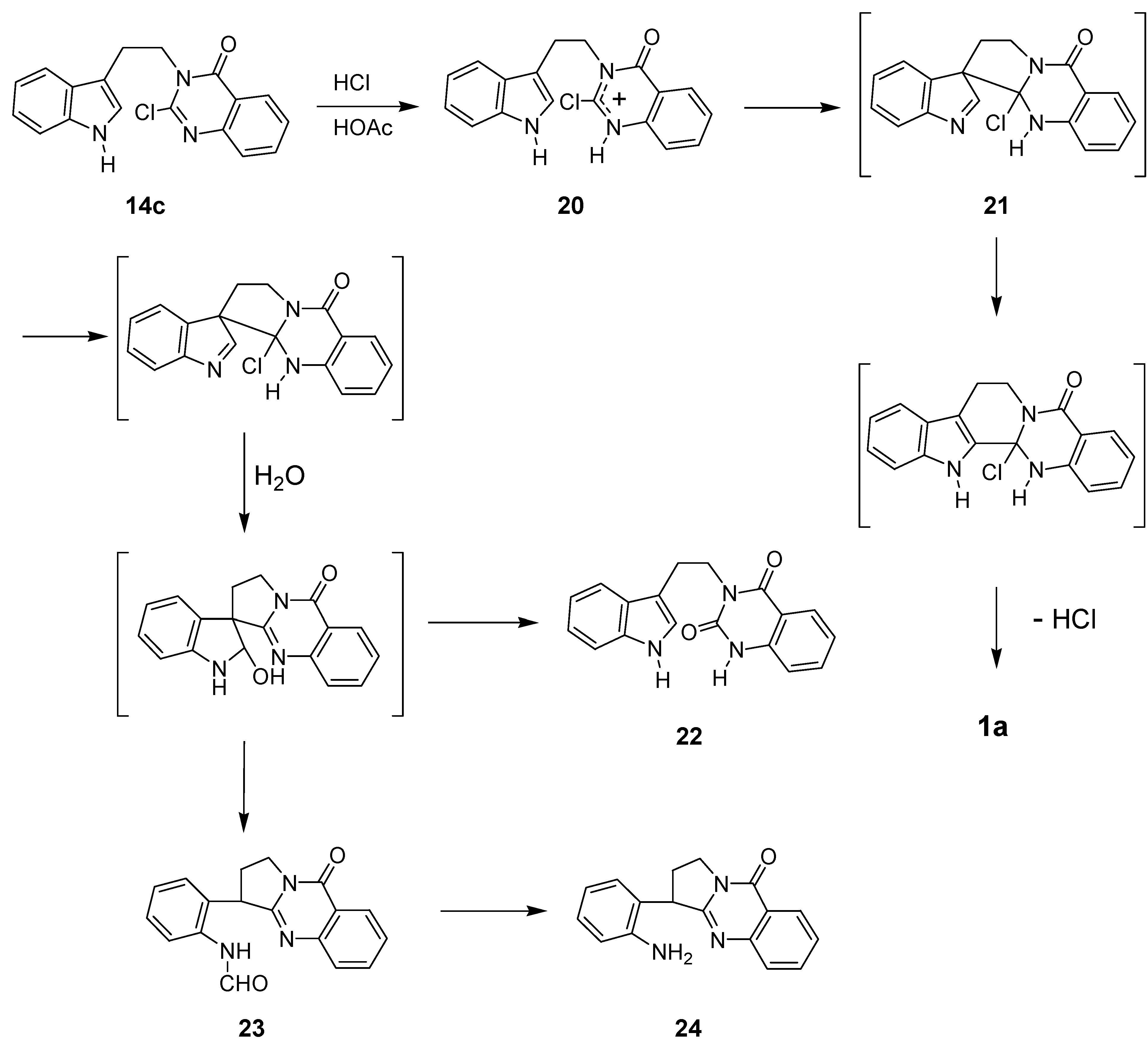 - Kaneko, C.; Chiba, T.; Kasai, K.; Miwa, C. A Short Synthesis of Rutecarpine and/or Vasicolinone from 2-Chloro-3-(indol-3-yl)ethylquinazolin-4(3H)-one: Evidence for the Participation of the Spiro Intermediate. Heterocycles 1985, 23, 1385–1390. [Google Scholar] [CrossRef]